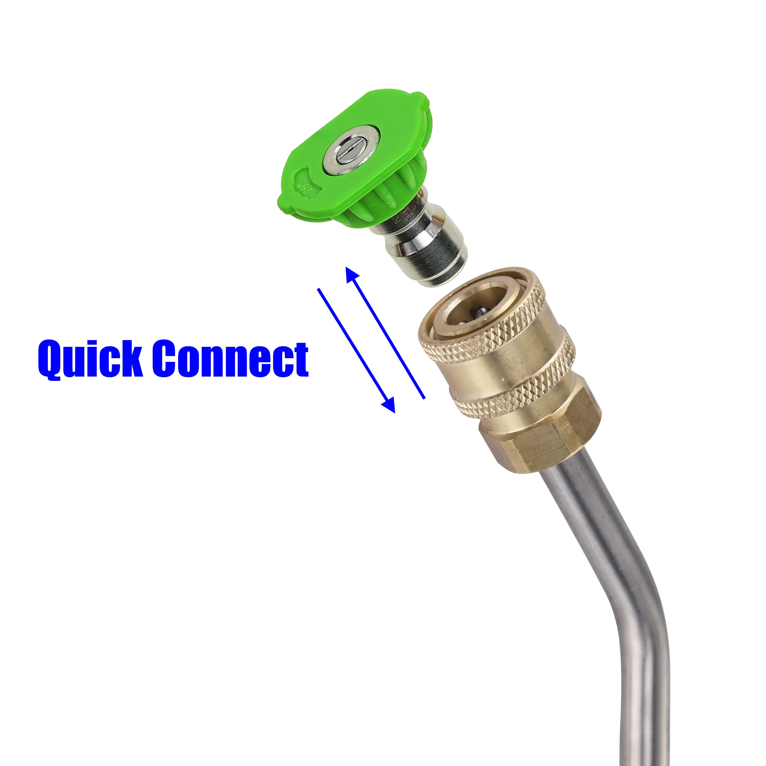 ·1/4’’ female quick connect socket connects to pressure washer nozzle. 1/4’’ male plug connects to pressure washer spray spray lance or wand.