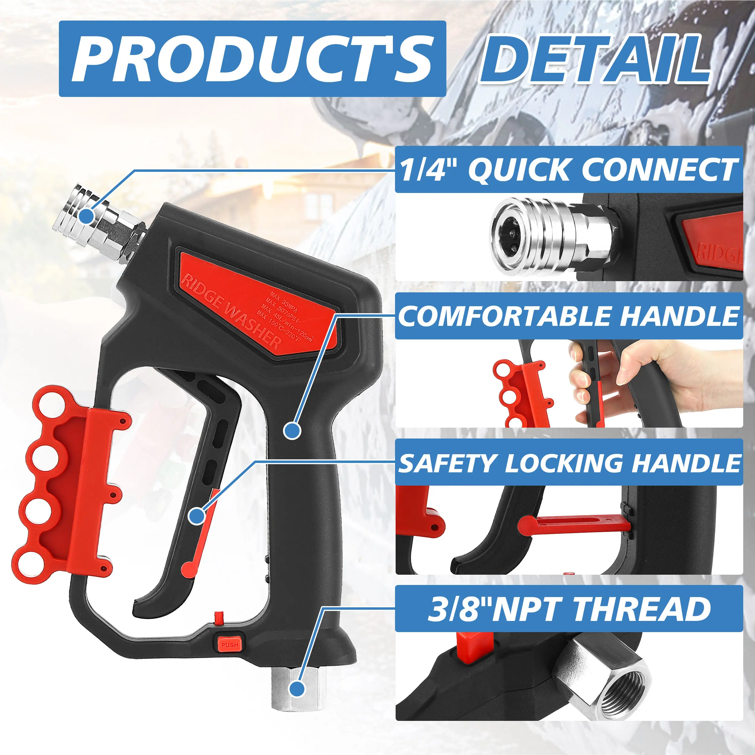 ·UPGRADE FEATURE: Pressure washer short wand comes with a locking handle, offering safety and convenience during the use of the high-pressure spray wand. The pressure washer wand swivel can handle water temperatures of up to 160 °C (320 °F) and has a water flow rate of 12 gallons per minute (GPM)