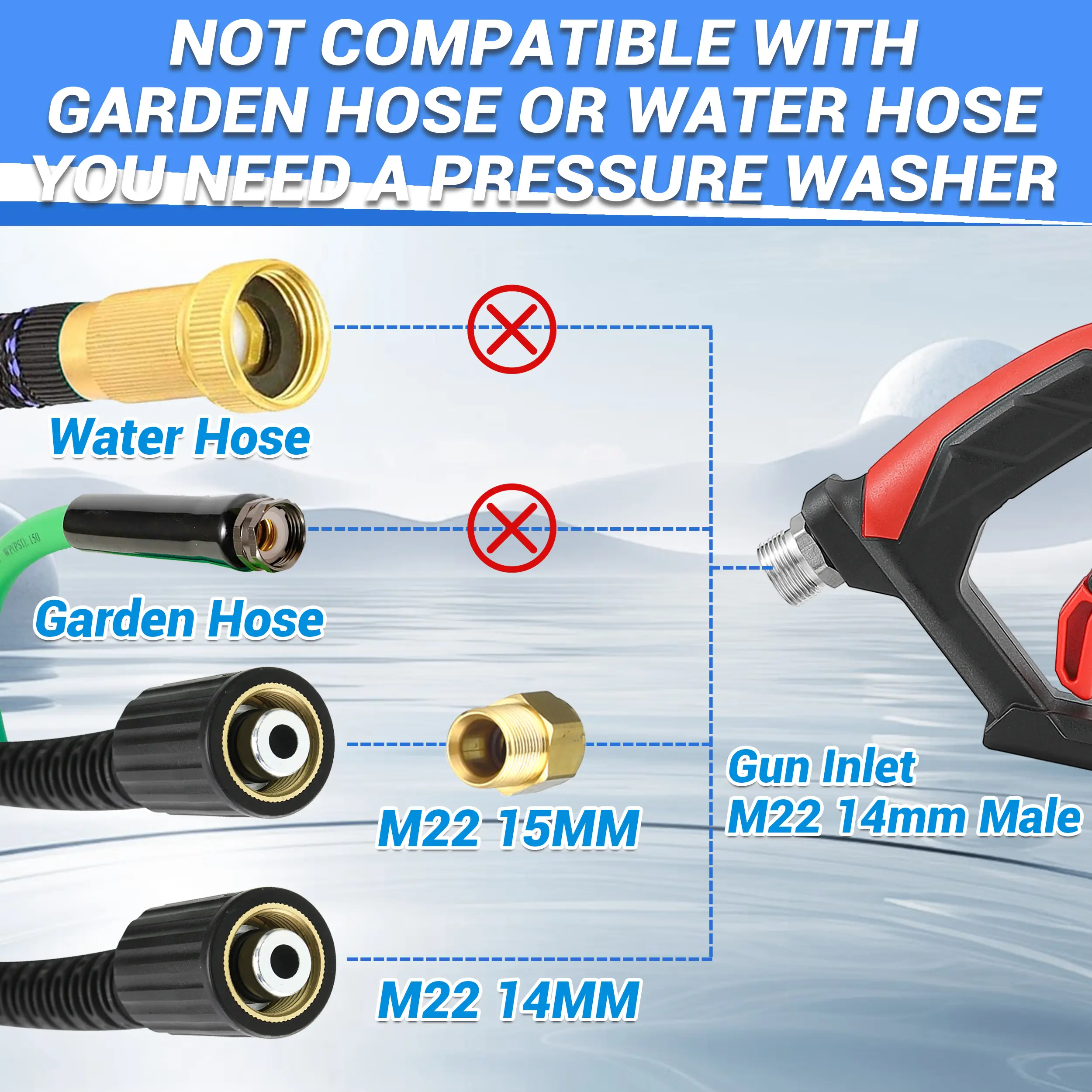 ·ATTENTION: Not Fit Garden Hose, Water Hose or Faucet Directly! The pressure washer wand has an M22-14 fitting. If your power washer hose has an M22 14mm fitting, connect the wand to the hose directly. If your hose has an M22 15mm fitting, use the brass coupler to connect the wand and hose