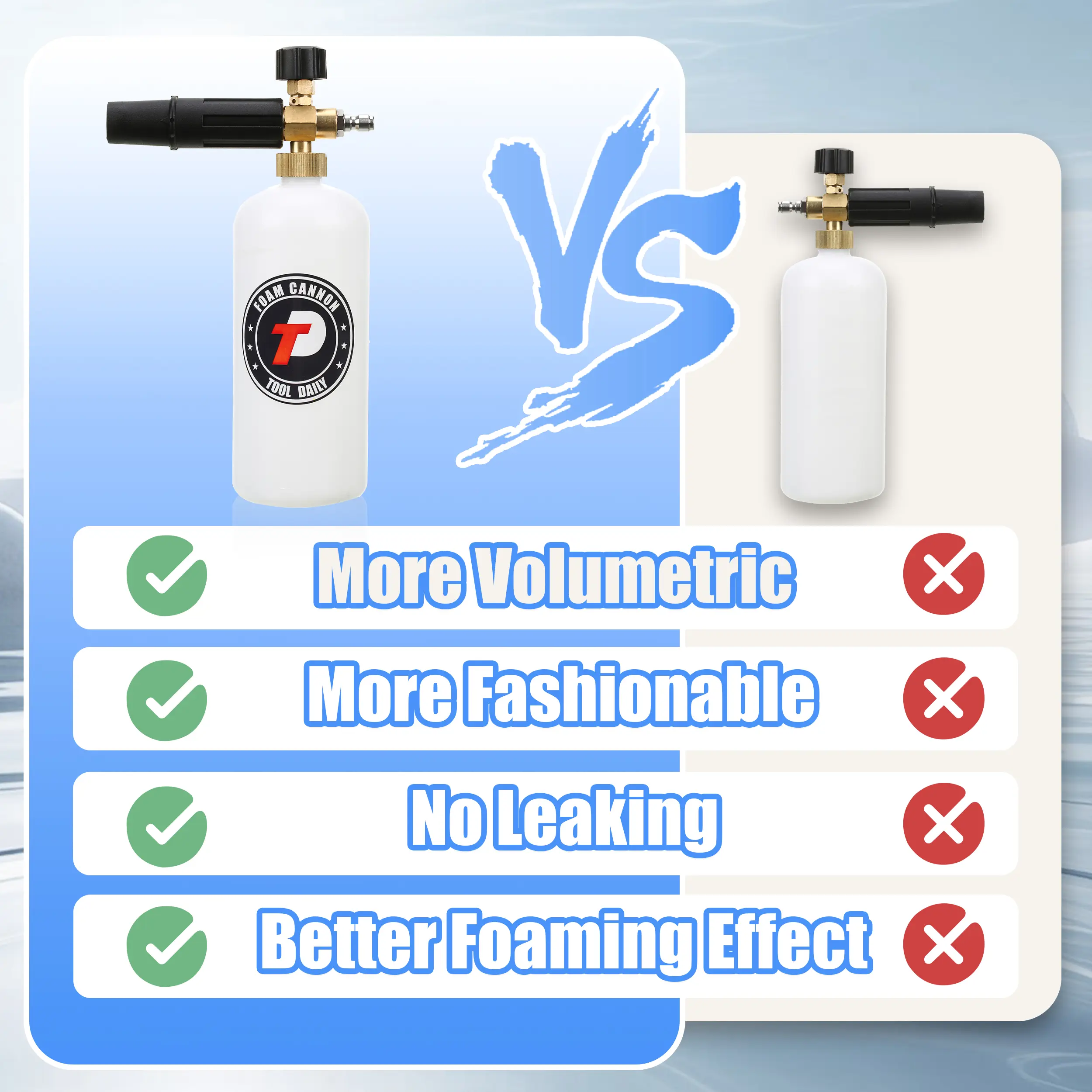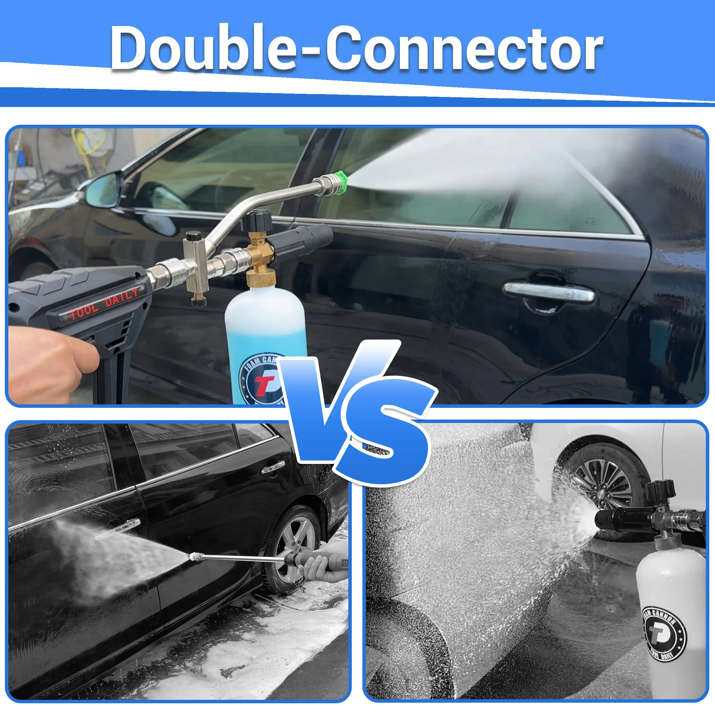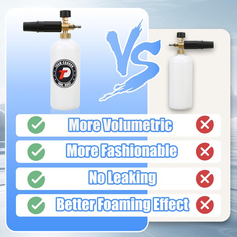 ·DOUBLE-ENDED DESIGN: The double-tip attachment has a unique two-end design. One end is longer for the pressure washer nozzle, and the other is shorter for the foam cannon. This setup ensures smooth water flow when using the nozzle, even with the foam dispenser attached