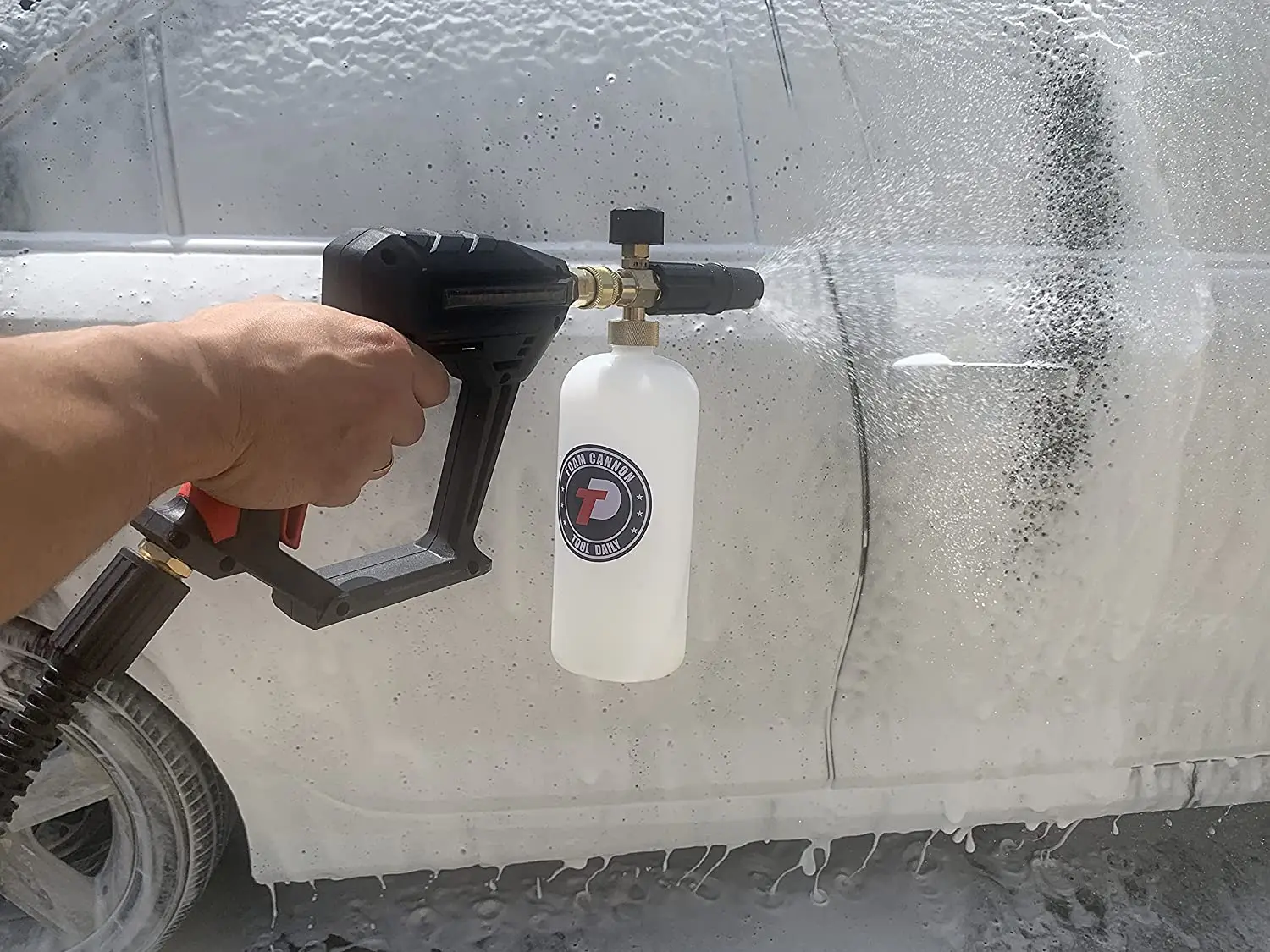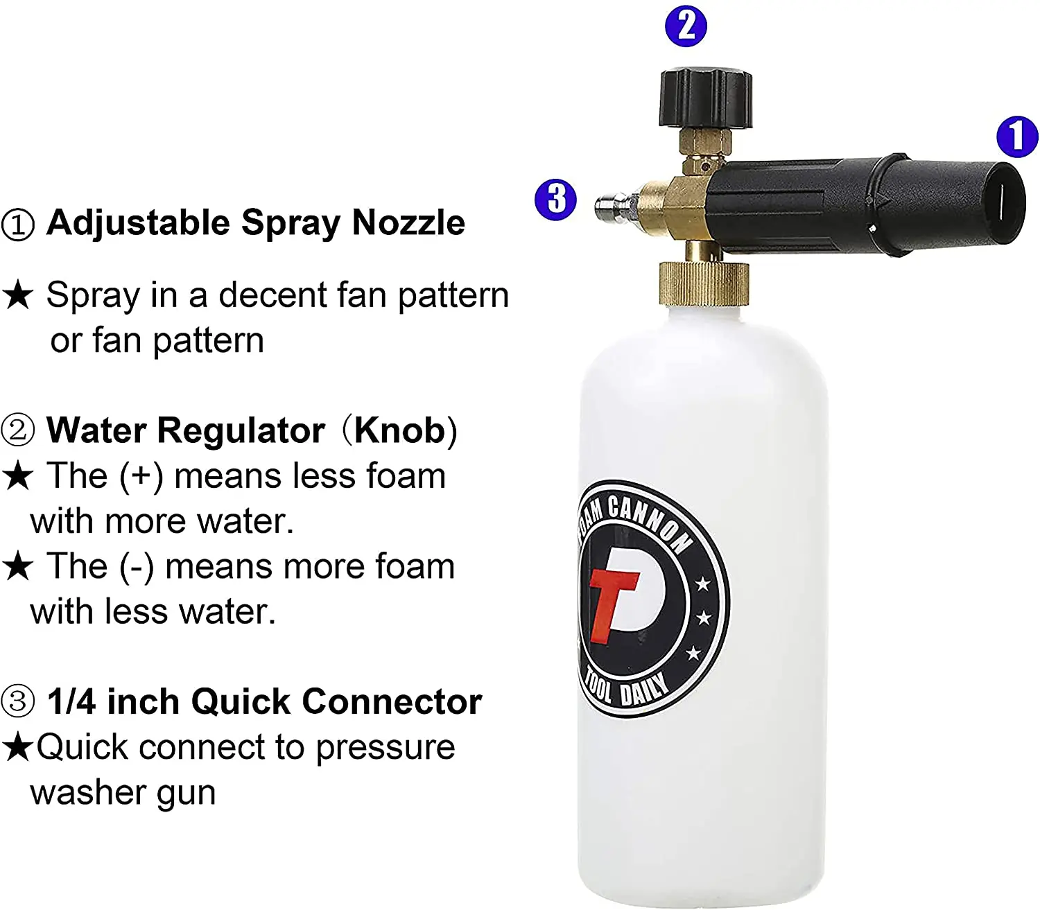 ·Adjustable Snow Foam Lance with 1/4" quick disconnection fitting. Container Capacity: 1 Liter / 0.22 Gallon. Specification: 1000 PSI to 3000 PSI. Adjustable nozzle for accurate mixing and foam generation. Turn the top knob right (-) to get the thickest mixture, adjust the nozzle to get a proper sprinkle pattern, and let it loose.