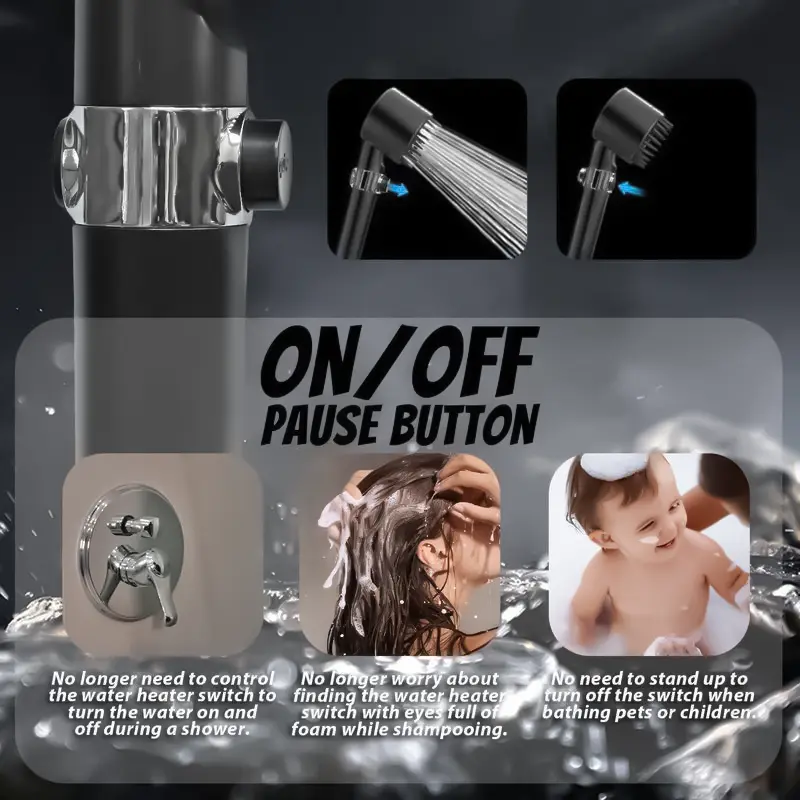 Customize your shower with rainfall, massage, or mixed modes. Detach the head for a powerful handheld jet to clean tiles/corners. The wand’s ON/OFF button pauses water flow—no need to adjust valves or reset temperature. Family-friendly and user-friendly.
