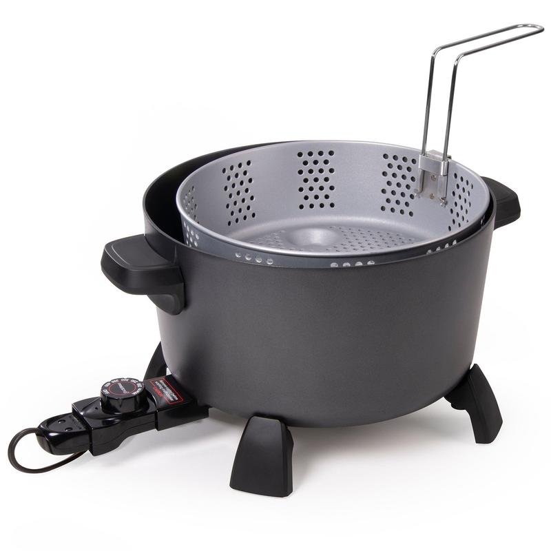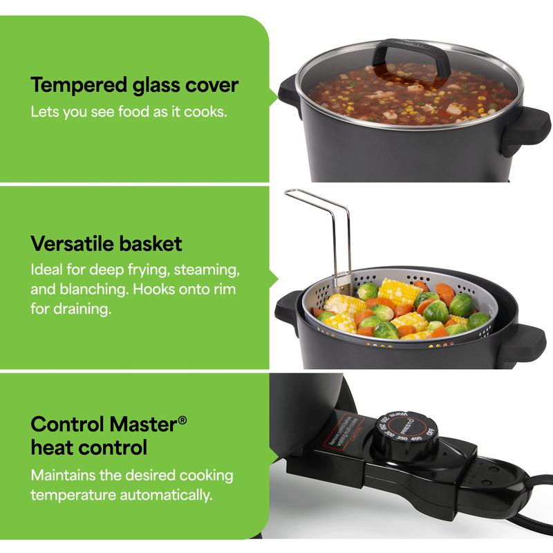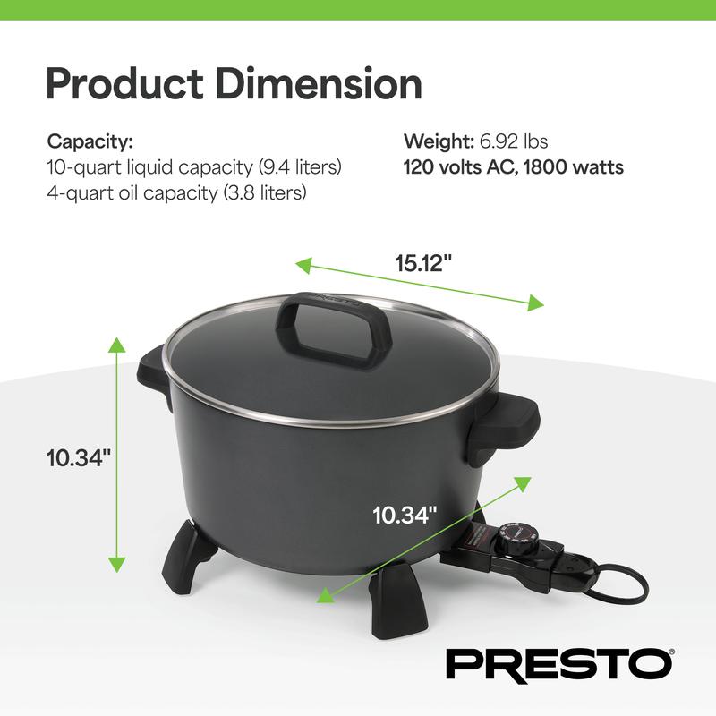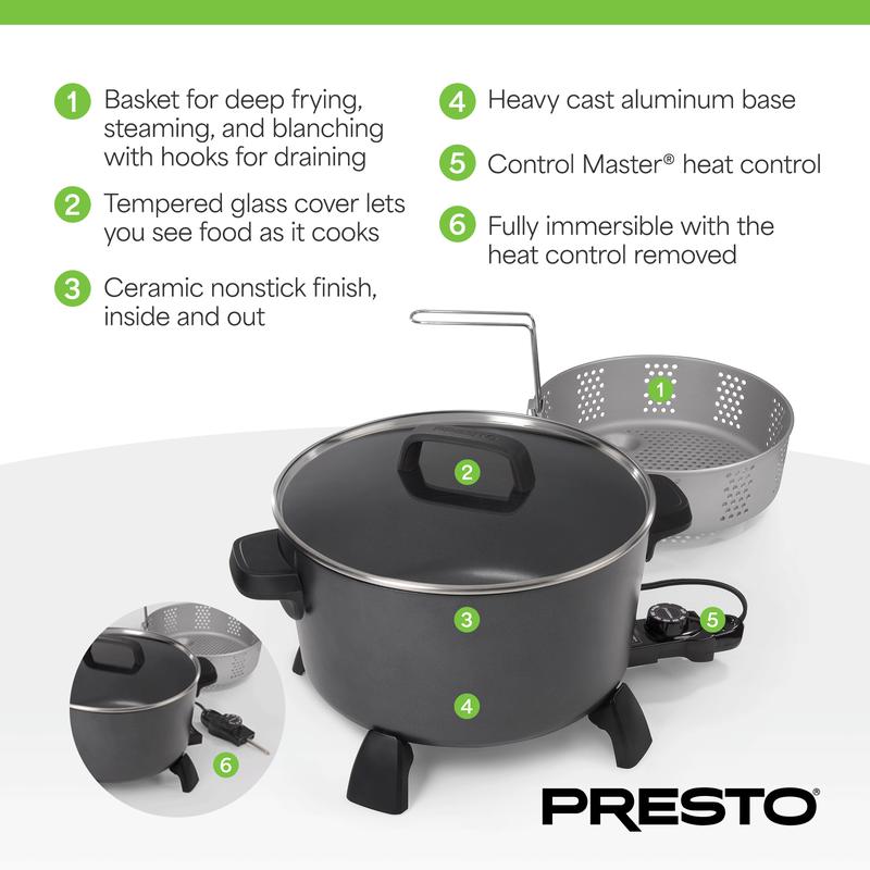 Designed to handle a wide range of culinary tasks, the Presto Kitchen Kettle XL is your ultimate kitchen sidekick, capable of steaming, stewing, roasting, boiling, and deep frying with unparalleled ease.At a generous 10-quart capacity, this extra-large multi-cooker is perfect for feeding a crowd. Whether you're whipping up hearty soups and stews, roasting succulent meats, or preparing family-sized portions of rice, pasta, and vegetables, the Kitchen Kettle XL has you covered. Its expansive cooking surface ensures even heat distribution, allowing you to achieve perfect browning and searing every time.But the real showstopper is the deep frying capabilities of this versatile machine. Fry up to 10 cups of crispy, golden-brown delights, from chicken and fish to french fries and donuts. The included multi-use basket makes deep frying a breeze, with a convenient hook that allows you to easily drain excess oil.Designed with your convenience in mind, the Kitchen Kettle XL features a PFAS-free ceramic nonstick interior and exterior, ensuring effortless cleanup after even the most indulgent frying sessions. The tempered glass cover allows you to monitor your culinary creations, while the Control Master heat control maintains the perfect temperature automatically, taking the guesswork out of cooking.Fully immersible with the heat control removed, this multi-cooker is a breeze to clean, and its heavy-duty cast aluminum construction promises long-lasting durability. Whether you're hosting a backyard barbecue, preparing a holiday feast, or simply whipping up a quick weeknight meal, the Presto Kitchen Kettle XL is the versatile kitchen companion you've been searching for.Unlock a world of culinary possibilities with the Presto 10-Quart Kitchen Kettle XL Multi-Cooker. Elevate your cooking game and impress your family and friends with this extraordinary all-in-one appliance.