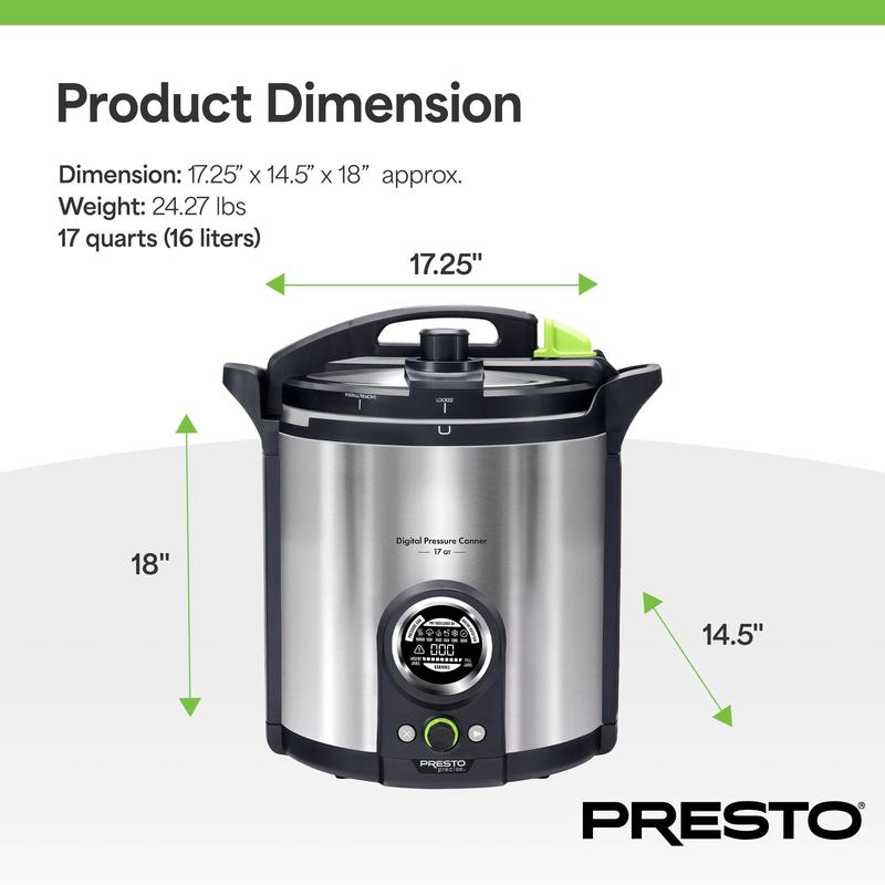 Introducing the Presto Precise 17-Quart Digital Pressure Canner, the ultimate home canning solution that combines precision, convenience, and safety. This innovative canner is designed to revolutionize the way you preserve your favorite foods, making the process easier and more efficient than ever before.At the heart of the canner pot is an advanced sensor technology that automatically maintains the exact temperature required for safe pressure canning, eliminating the need for constant monitoring. Whether you're canning at sea level or high altitudes, this canner adapts seamlessly, ensuring consistent and reliable results every time. The extra-tall design accommodates quart-sized jars, allowing you to process larger batches with ease.The user-friendly digital display guides you through each step of the canning process, from selecting the method to setting the processing time. A built-in timer ensures accurate timing, giving you the confidence to preserve your favorite meats, poultry, fish, vegetables, and other low-acid foods.The unit also doubles as a boiling water canner, allowing you to safely preserve high-acid foods like fruits, jams, jellies, pickles, and salsa. The canner preheats the jars and keeps them at the perfect temperature until you're ready to fill and process them, streamlining the entire canning process.With 10 built-in safety features, including a cover locking system and an alert symbol for incomplete canning processes, the pressure canner provides peace of mind throughout your canning journey. Elevate your home-preserving experience and unlock the full potential of your kitchen with the Presto Precise 17-Quart Digital Pressure Canner.