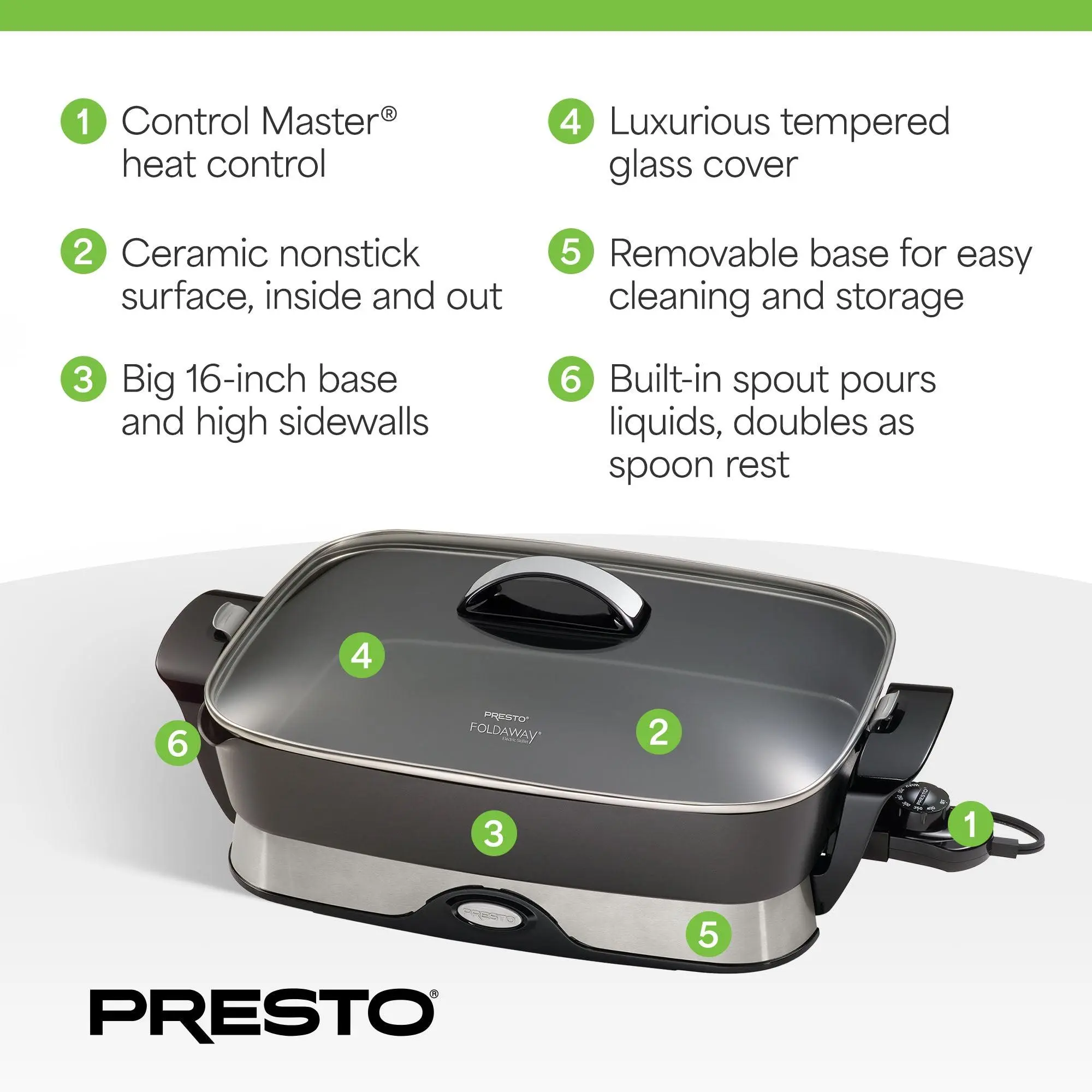 Introducing the Presto 16-Inch Electric Foldaway Skillet, the ultimate kitchen companion that redefines versatility and convenience.Designed with the modern home cook in mind, this electric skillet boasts a spacious 16-inch base and high sidewalls, providing ample cooking and serving capacity to handle even your largest culinary endeavors. From roasting and frying to grilling, stewing, and baking, this skillet is a true master of all trades, allowing you to effortlessly create a wide array of mouthwatering dishes with ease.The secret to the Presto's exceptional performance lies in its innovative features. The Control Master heat control automatically maintains the desired cooking temperature, ensuring precise and consistent results every time. The ceramic nonstick finish, both inside and out, delivers exceptional food release and easy cleanup, making this skillet a breeze to use and maintain. When entertaining, the tempered glass cover with a stay-cool handle transforms this skillet into a stylish and functional buffet server, allowing your guests to indulge in your culinary creations with ease.Designed for convenience and efficiency, the Presto Electric Foldaway Skillet is a true space-saver. With its virtually warp-proof heavy cast aluminum base and the ability to detach the handles and nest the base inside the pan, this skillet can be easily stored, freeing up valuable real estate in your kitchen.Elevate your cooking experience and savor the joy of effortless, delicious meals with the Presto 16-Inch Electric Foldaway Skillet. Whether you're a seasoned home chef or a culinary enthusiast, this versatile appliance is poised to become an indispensable addition to your kitchen arsenal.