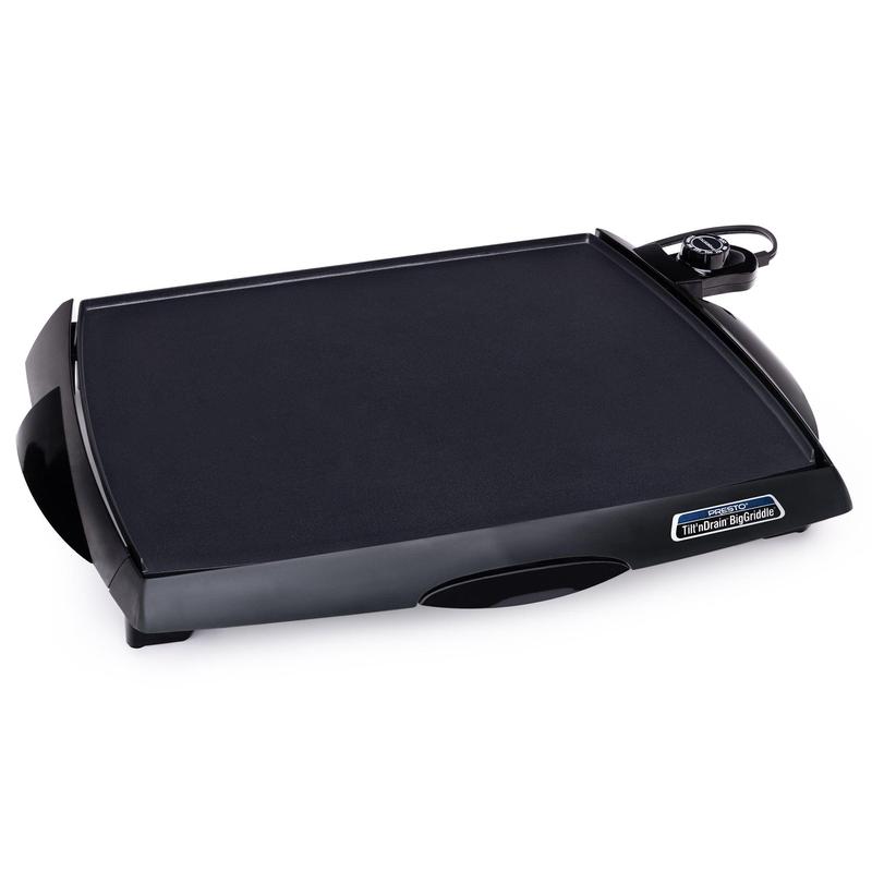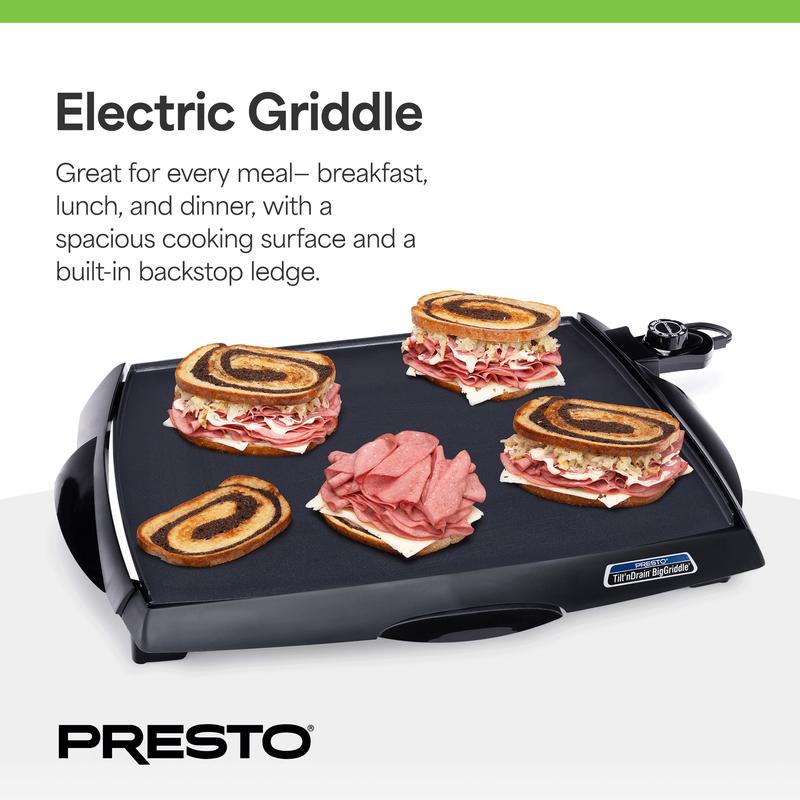 Unlock the power of the Presto Tilt 'n Drain Big Griddle, the ultimate kitchen companion that revolutionizes your cooking experience. Boasting a generous cooking surface, this griddle allows you to cook up to 50% more food than other jumbo models, making it the perfect choice for feeding a crowd. Imagine effortlessly preparing up to 12 slices of French toast at once, or searing juicy burgers and sausages to perfection. The secret lies in the Tilt 'n Drain feature, which enables you to easily adjust the grilling surface from a level plane for delicate items like eggs and pancakes, to a tilted draining position for meats, ensuring optimal cooking and effortless cleanup.Elevating your cooking game even further this big electric griddle is equipped with a Control Master heat control that maintains the perfect temperature automatically, taking the guesswork out of your culinary endeavors. The ceramic nonstick surface ensures stick-free cooking and easy cleanup, while the PFAS-free design promotes healthier meal preparation.Designed with convenience in mind, the griddle features a slide-out drip tray that empties easily, allowing you to focus on the task at hand without the hassle of messy spills. And when you're done, the entire unit is fully immersible with the heat control removed, making cleanup a breeze.Whether you're hosting a family brunch, whipping up a quick weeknight dinner, or catering a backyard gathering, the Presto Tilt 'n Drain Big Griddle is the ultimate kitchen companion that will elevate your cooking game and bring everyone to the table with a smile. Unlock the secrets of effortless, versatile cooking and experience the difference that America's best-selling electric griddle brand can make in your kitchen.