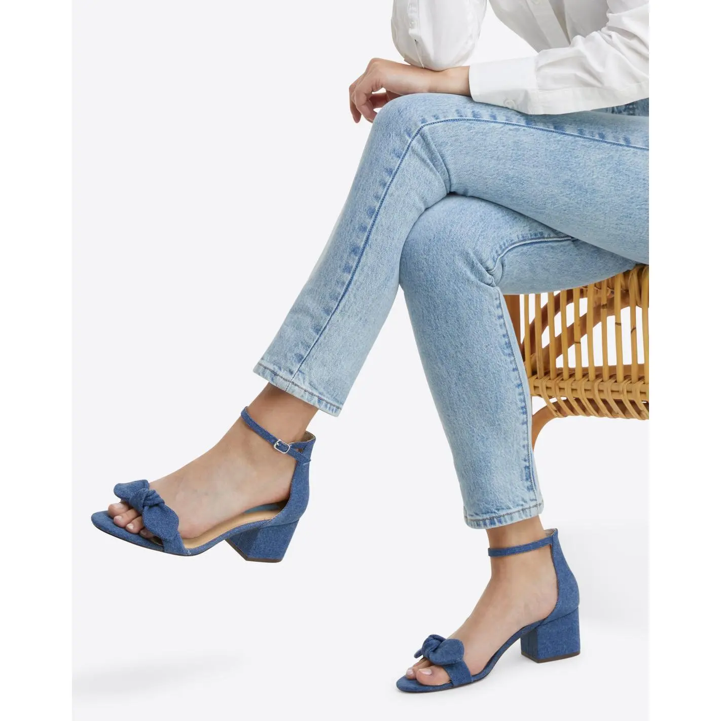 The perfect day-to-night sandal. A feminine twist on the classic block heel, the Preston Sandal has a 100% cotton denim upper and features a knotted bow, an adjustable ankle strap and a walkable heel, making it a super-versatile go-to for work or weekends at home or while traveling. Wear them with dresses and skirts, or your favorite white pants.