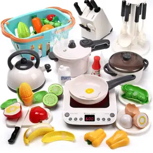 This set includes a pressure cooker, frying pan, cooking utensils, induction cooktop, kettle with a pull-out spout, knife block, colorful peelable fruits and vegetables, and a shopping basket. Everything needed for an engaging play session is here, promoting motor skills and life skills through interactive role play.