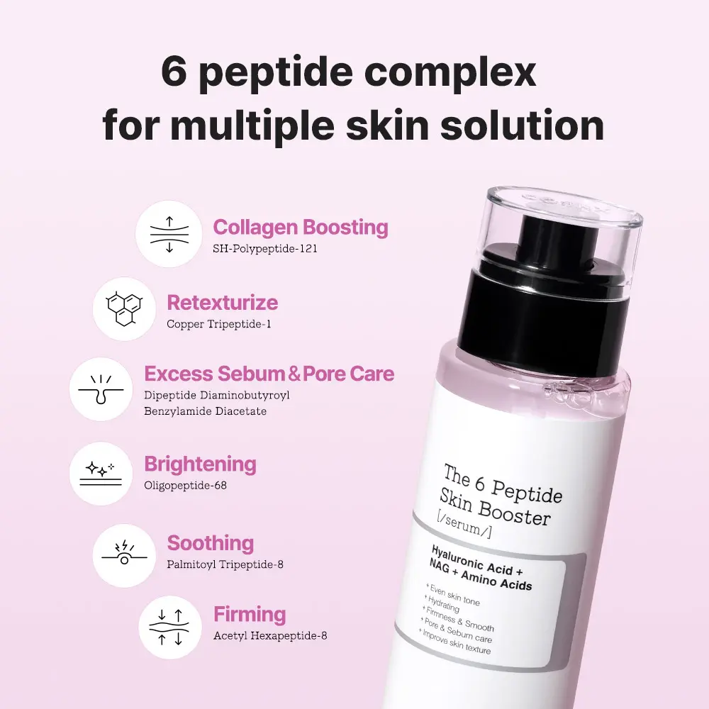 The 6 peptide skin booster contains 6 multi peptides that boost overall skin condition such as pore & sebum, firmness, fine lines, skin texture, skin tone and soothing. It is perfect to use as the first step of skincare routine to prep and boost.