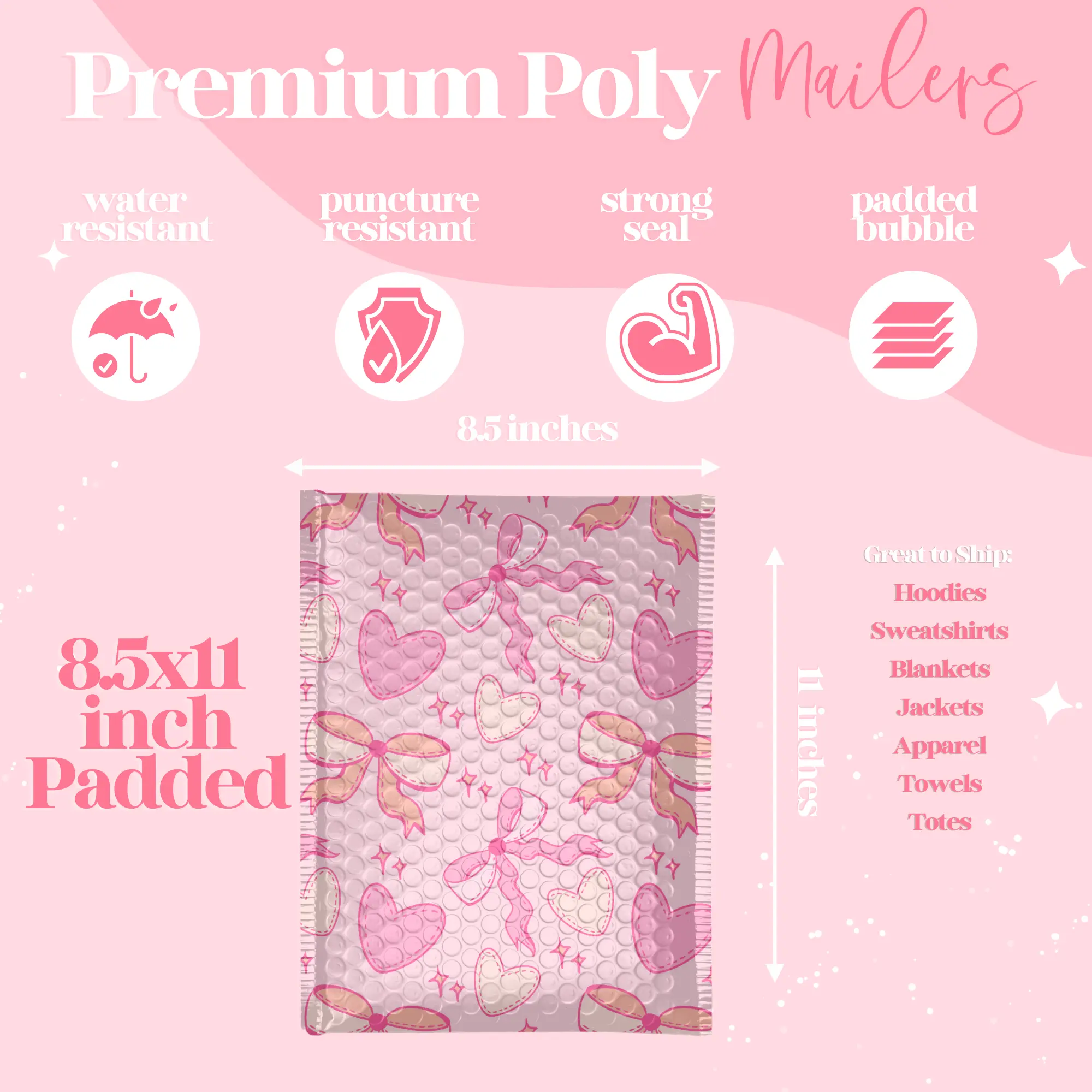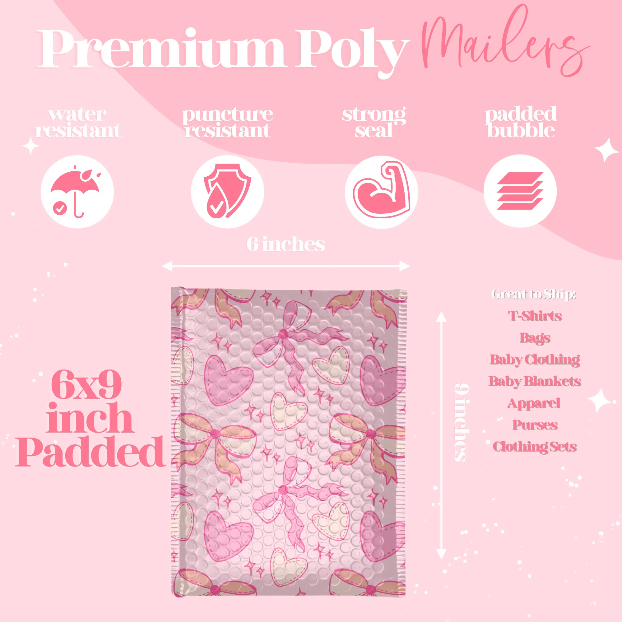 Versatile and Durable: Whether you're shipping clothing, accessories, or handmade goods, Pretty Package padded poly mailers are up for the task. Crafted from high-quality materials, these mailers are tear-resistant and provide a protective barrier against the elements. They are fully padded with bubble wrap to Ensure your items reach their destination in pristine condition, every time.