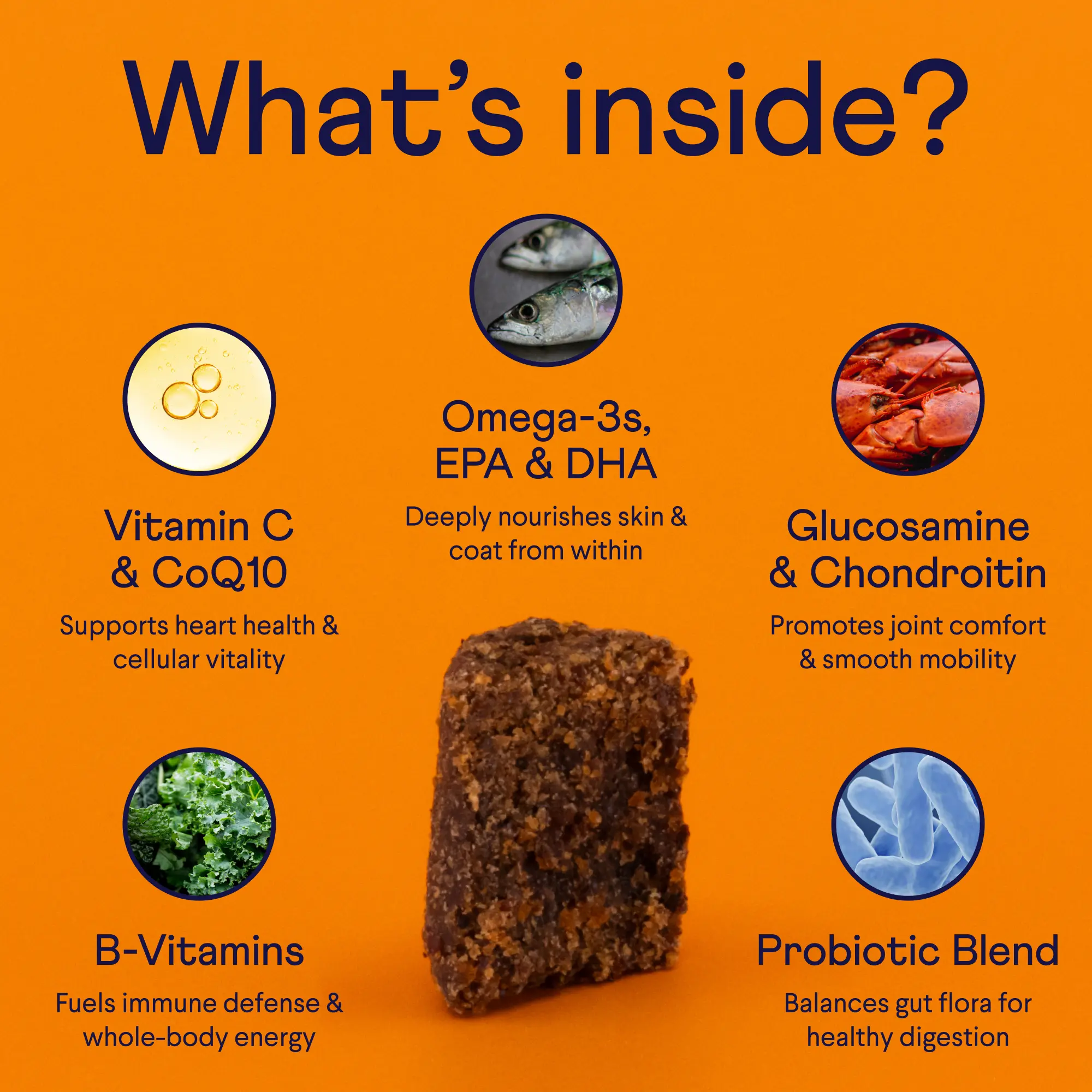 Multivitamin chews help support immune defense, healthy digestion, joint mobility, and energy levels.