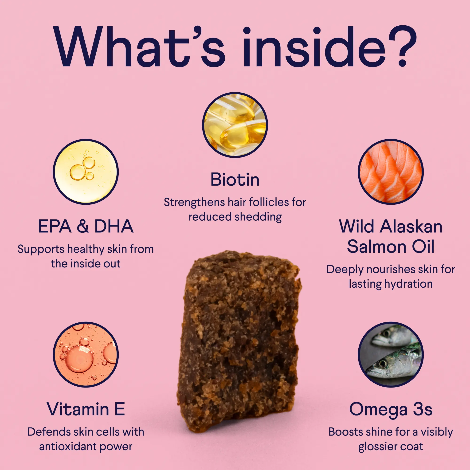 ·Skin & Coat (90ct): Features wild Alaskan salmon oil, biotin, and omega 3s, 6s, and 9s to hydrate skin and add coat shine
