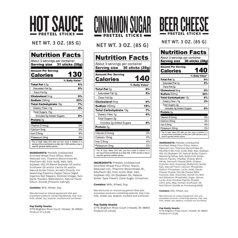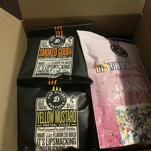 Perfect for snack cravings: smoked Gouda & beer cheese are my fav: dill pickle is fire : yellow mustard tastes like the ones at the ballpark, kids loved the sweet birthday cake sticks, like cleaning the bowl of batter out with pretzels while baking a cake.š I really like the cinnamon sugars too.