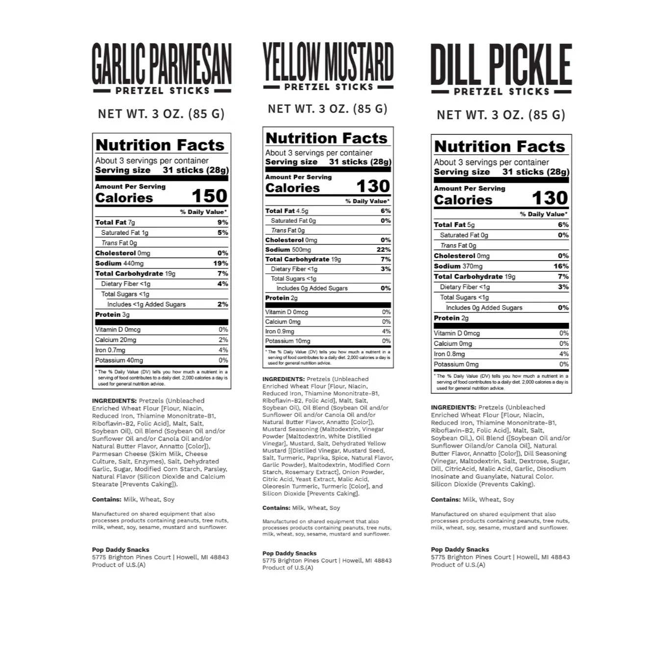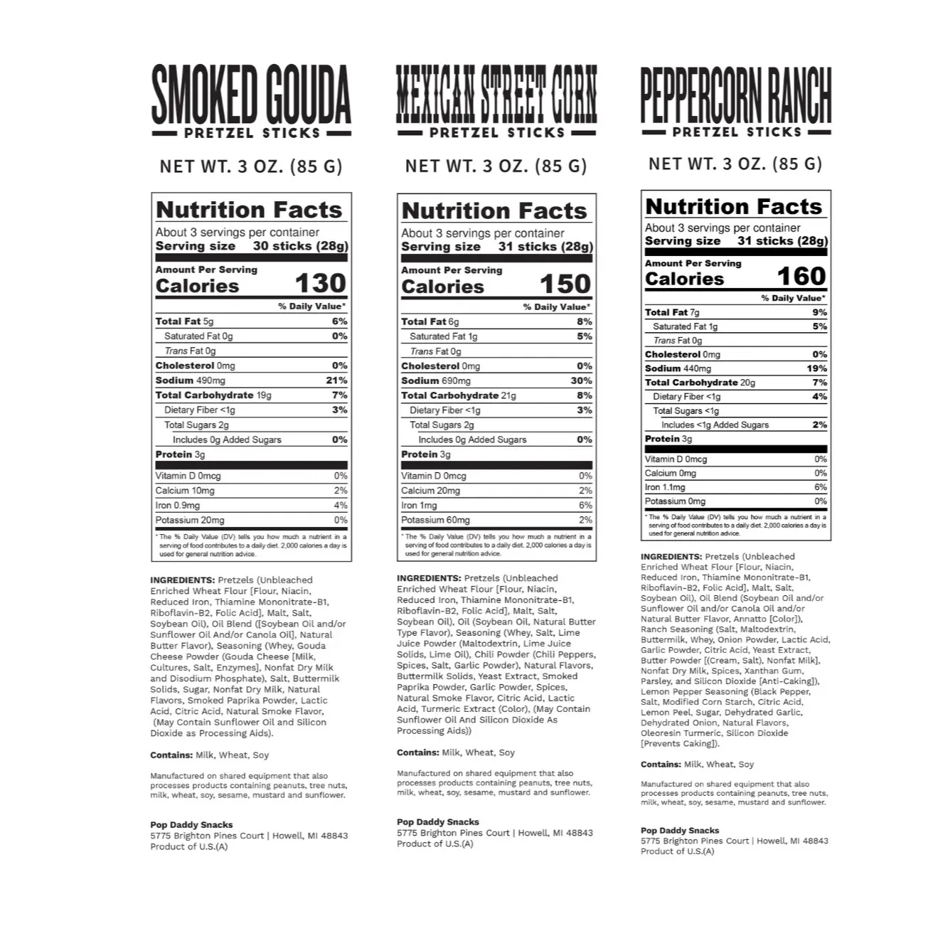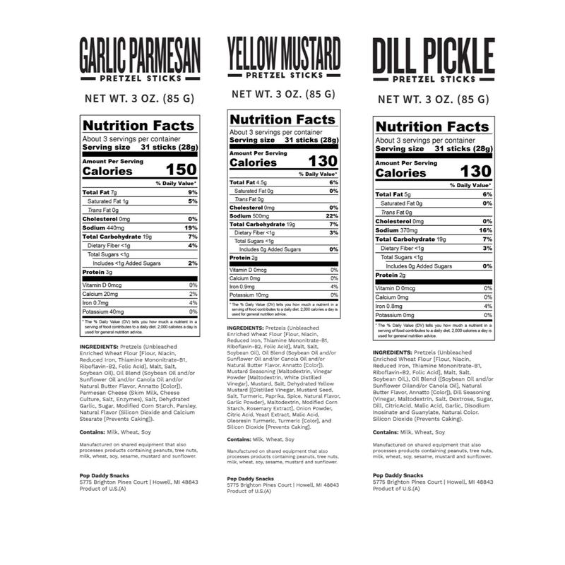I am very satisfied with my purchase from Pop Daddy. The shipping and packaging was amazing and on time. The flavors are delicious and the size of the bags are great. Thr quality of the size of the pretzel sticks are I highly recommend these pretzels and will order other flavors. Thanks Pop Daddy...