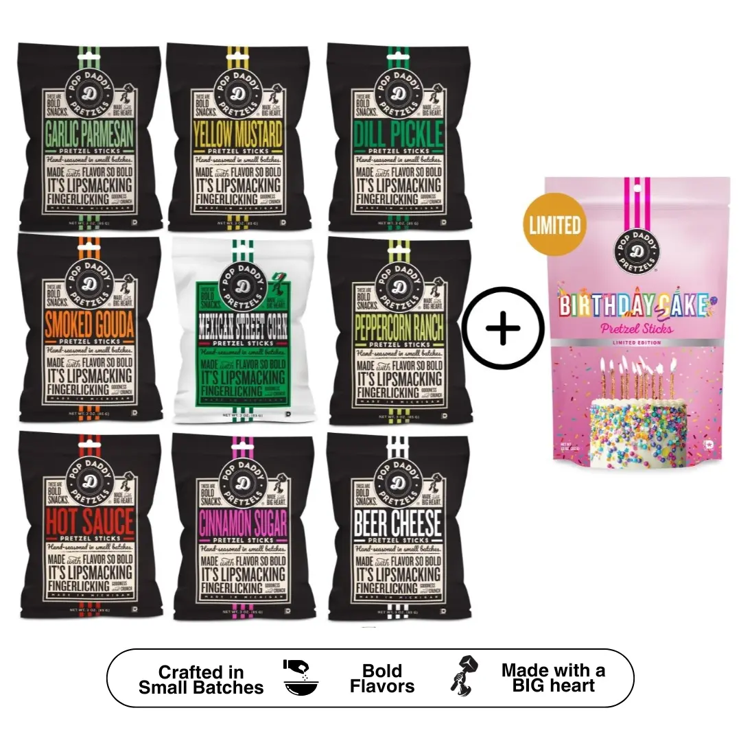 I love the variety pack itās great for a party especially for people with different taste buds. My top favorites are the dill pickle yellow mustard garlic Parmesan birthday cake cinnamon sugar; hot sauce/perpercorn ranch smoke Gouda were good;