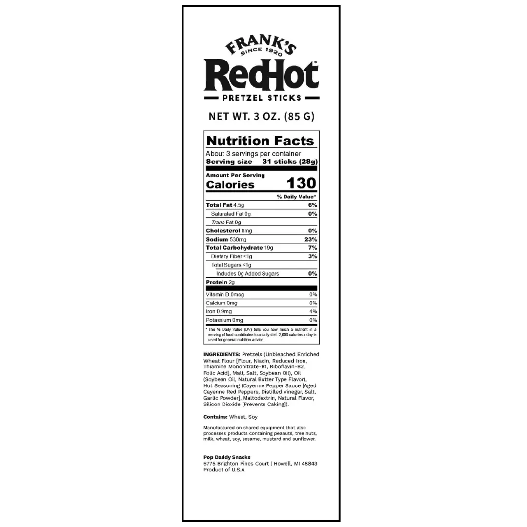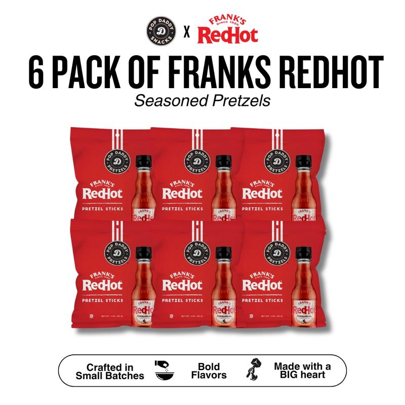 Your favorite hot sauce, now in a pretzel! Pop Daddy Frank's RedHot Pretzel Sticks bring together the iconic kick of Frank's RedHot with our signature seasoned pretzels. A must-try for spice lover!