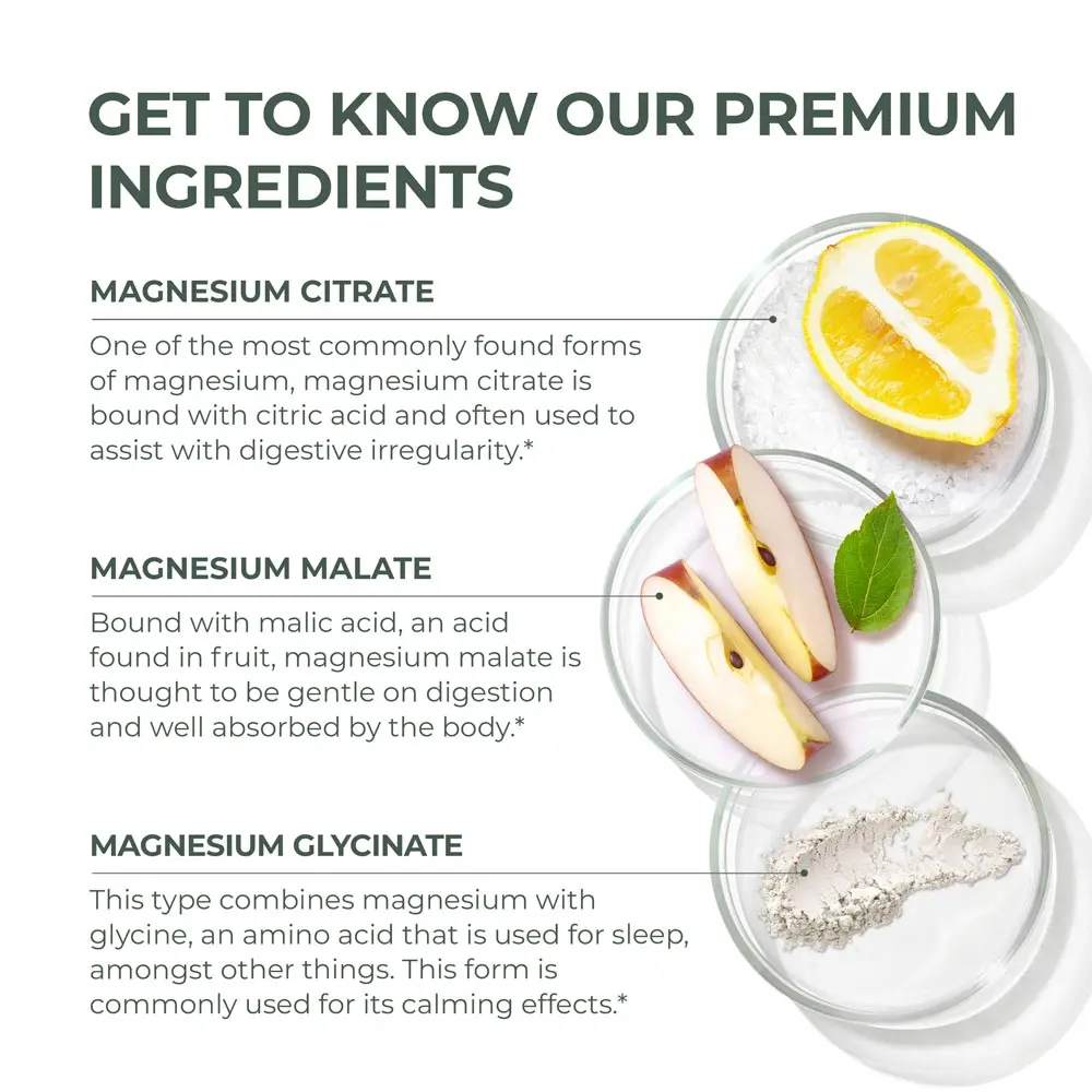 ·Features three highly bioavailable types of magnesium: citrate, malate, and glycinate*