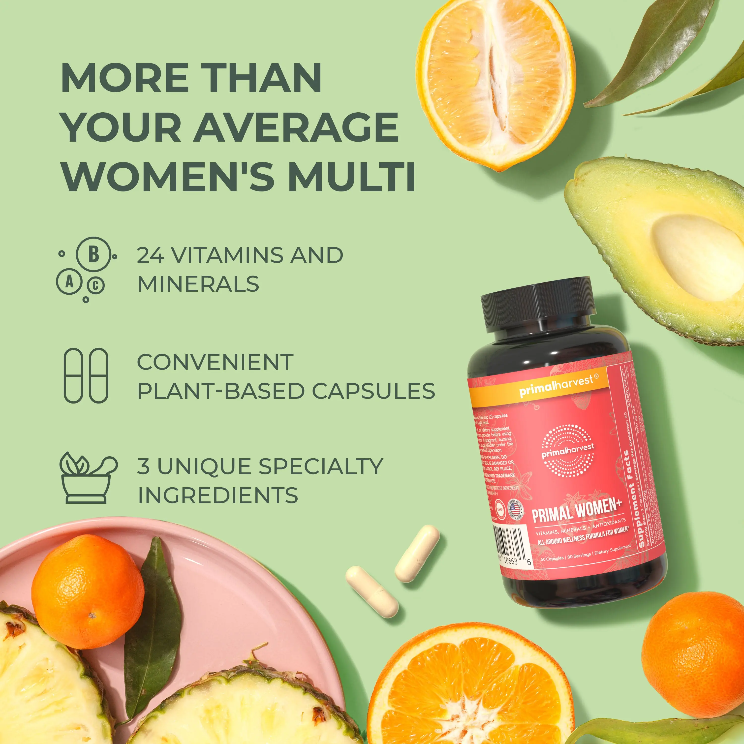Primal Women+ is a comprehensive multivitamin designed specifically for women, packed with 24 essential nutrients to support overall health and well-being.