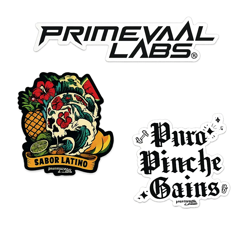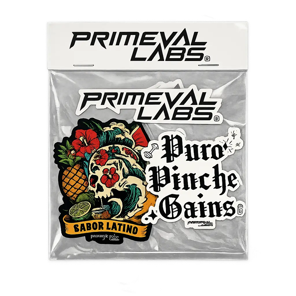 Enjoy our fun three pack of stickers! Each pack contains a Primeval Labs logo, Sabor Latino Skull, and Gains Sticker.