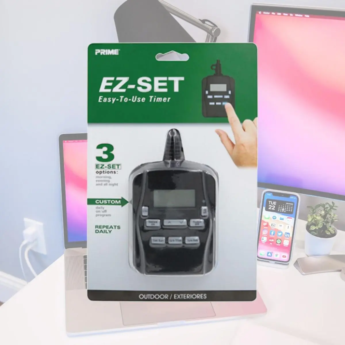 Custom on/off program buttons illuminate to indicate active program. Custom countdown from 1 minute to 24 hours. 2-Grounded outlets. Compatible with CFL, LED, Fluorescent, Xenon, Halogen and incandescent. EZ SET Alarm are 5am-8am, 5pm-12am and 5pm-8am. Buttons Illuminate to indicate active program. Features 24 Hour repeating cycle. Weather resistant. Plug in power source. Specifications Color: Black. Programmable: Yes. Amppere: 15A. Voltage: 120V. Weight: 0.48 lbs.