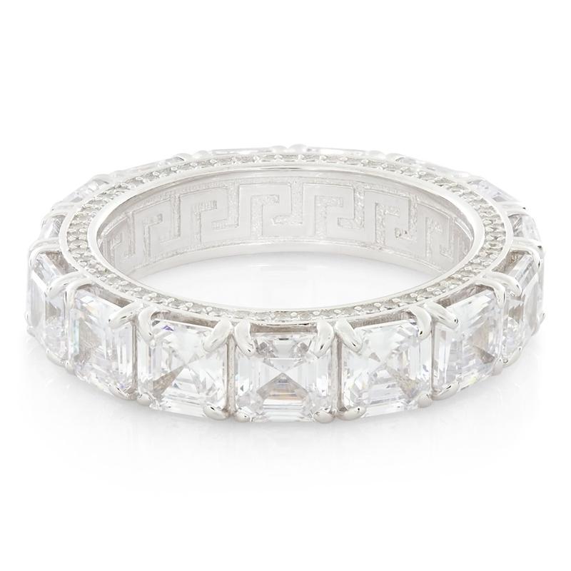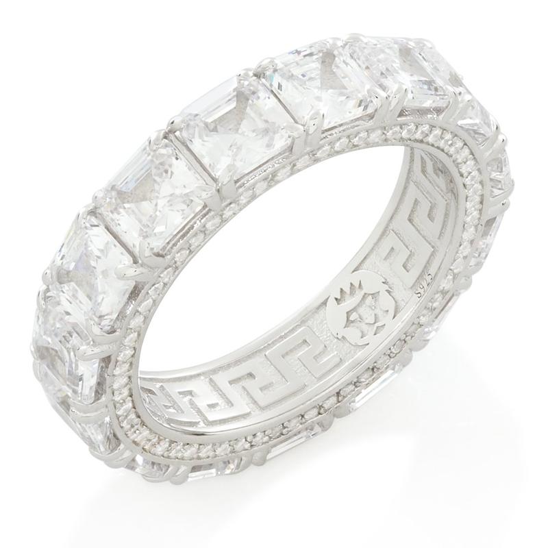 This piece features princess-cut stones around the entire band, with smaller brilliant-cut stones on each side. The inner details include the King Ice stamp and signature Greek-Key pattern.