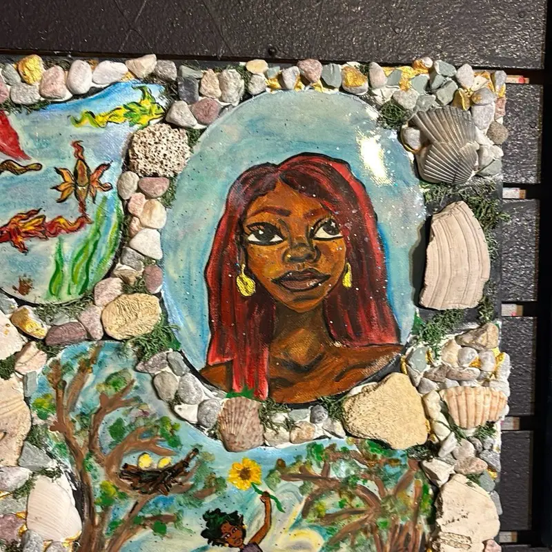 A mermaid sits on a rock, reflecting while the painting depicts multiple perspectives and dimensions.