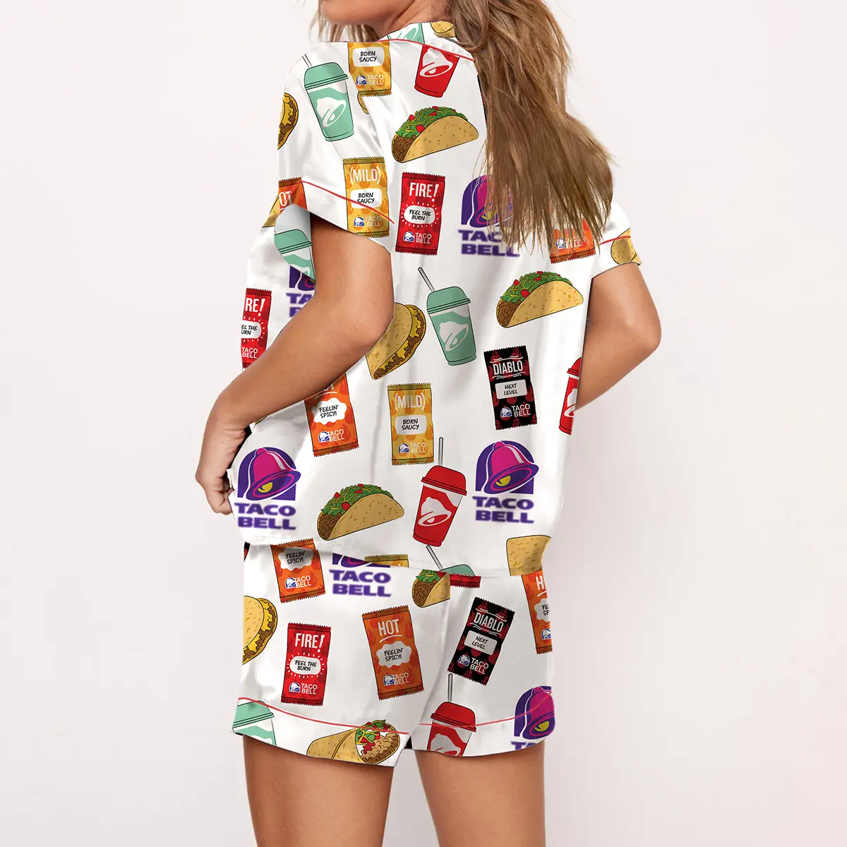 Taco Print Pajama Set For Women Print Comfy Satin Sleepwear & Loungewear Pjs Short Sleeve Top & Bottoms Shorts Without Pockets - SHESHOW