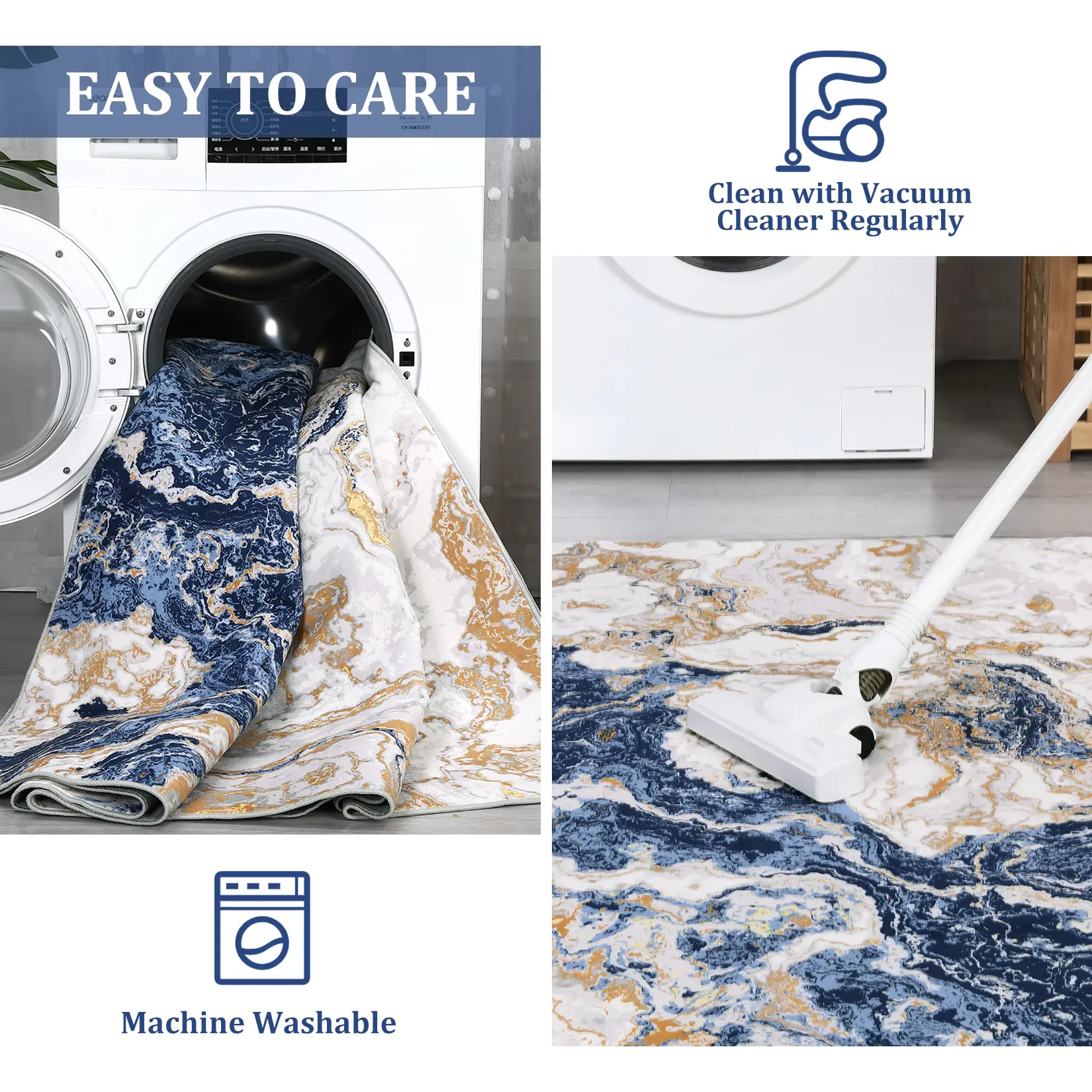 WASHABLE RUG: It's not hard to understand the appeal of machine washable rugs. Rather than panicking when you knock over your glass of wine, your kid leaves muddy footprint, or your furry friend has an accident, you can simply throw the rug in your washing machine on the cold setting and go back to enjoying your life. Make the most of your time at home with our pet-friendly and easy to clean area rugs.
