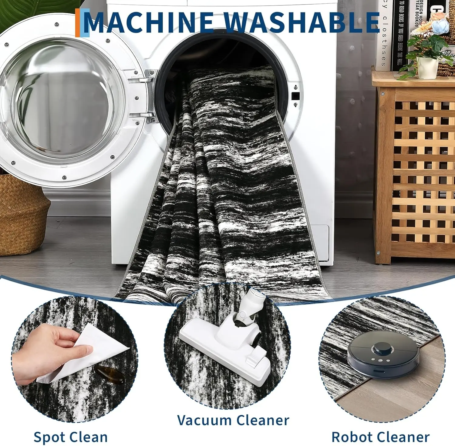 Machine Washable Convenience: Enjoy the ease of maintaining your area rug with its machine washable feature. Simply toss it in the washing machine for a quick and hassle-free clean, ensuring your rug stays fresh and vibrant without the stress of complicated cleaning methods.