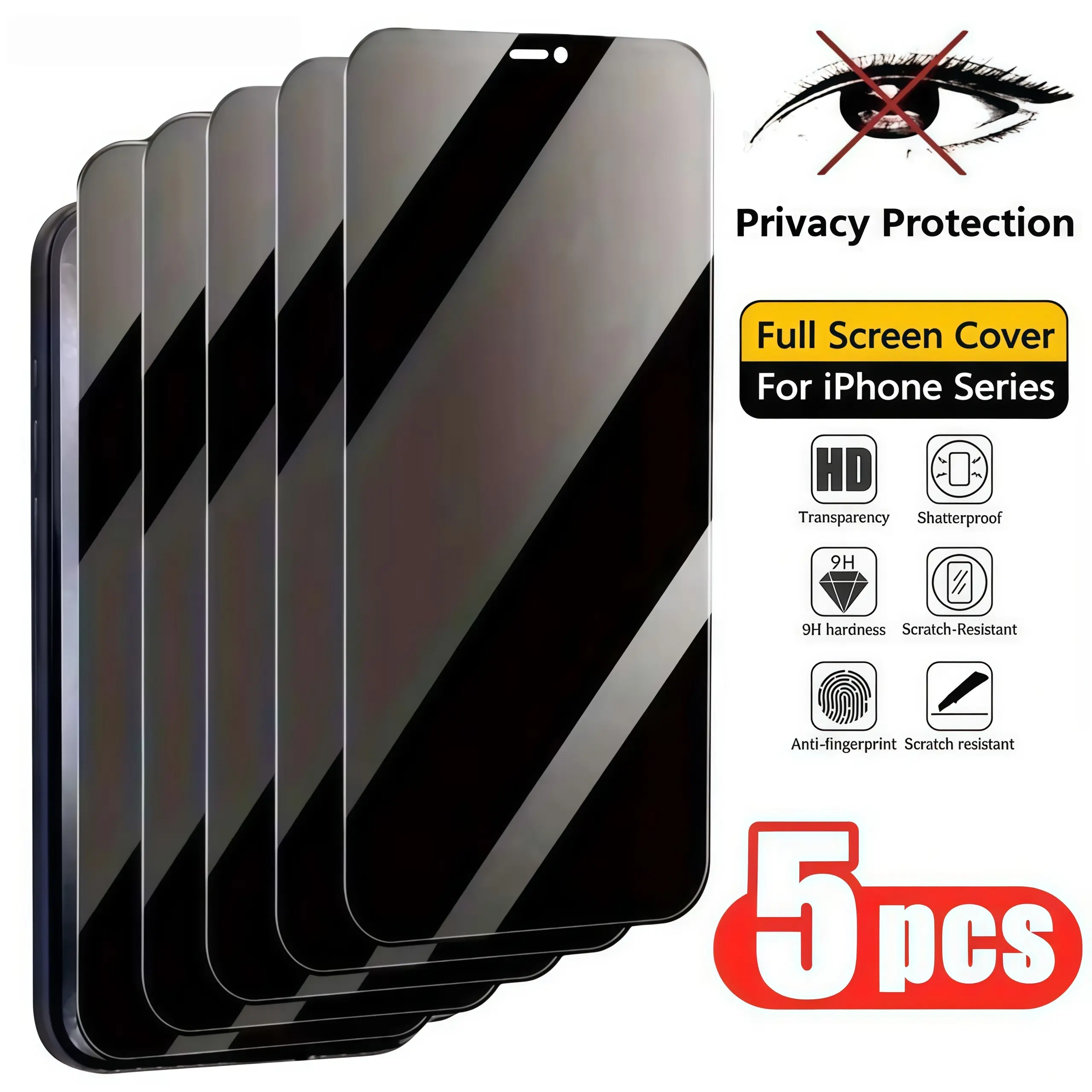 5 Pieces Pack for your iPhone 16, 17, 15, 14, 13, 12, 11, 16e, Plus, Air, Pro Max. This tempered glass protector offers anti-peeping, scratch-resistant, and fingerprint-resistant features. Perfect for enhancing privacy and durability.