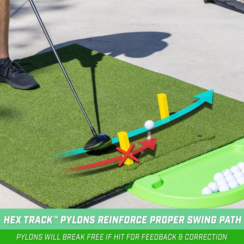 ·HEX TRACK GUIDES: 4 yellow HEX pylons provide guidance and instant feedback on your swing path; Position pylons in varying combinations to practice draws or fades and fix hooks and slices (instructions included)