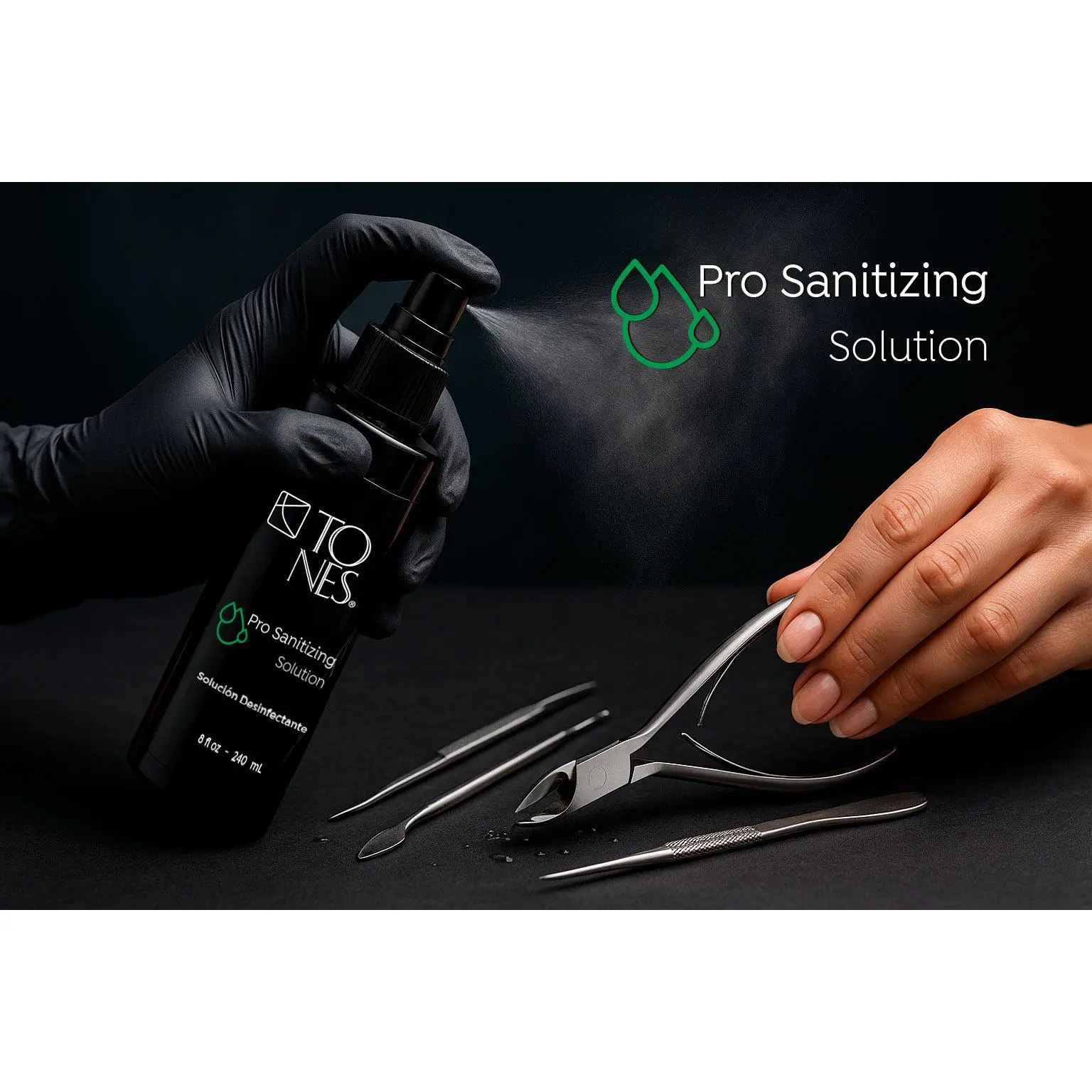Tones Pro Sanitizing Solution is a professional-grade surface cleanser and sanitizer for the nail table — disinfecting tools, wiping surfaces, and preparing the nail service environment for each client. Clean table, clean service, every time.