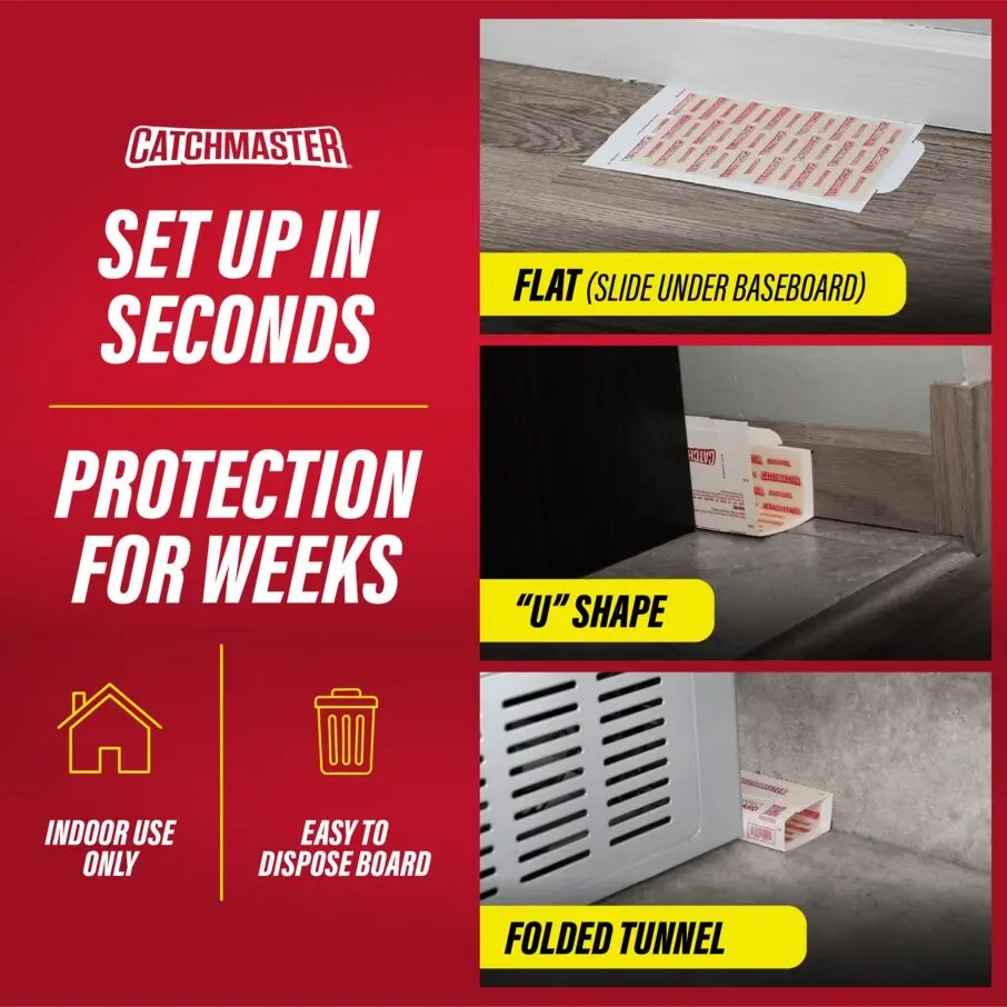 ·YEAR-ROUND PROTECTION: Catchmaster glue traps for mice and rats are safe, non-toxic and mess-free. The insect and mouse traps are perforated to tear off and place glue directly against baseboards to secure traps and prevent drag offs. When placed in an area with normal conditions, mouse traps indoor for home can last up to one full year.