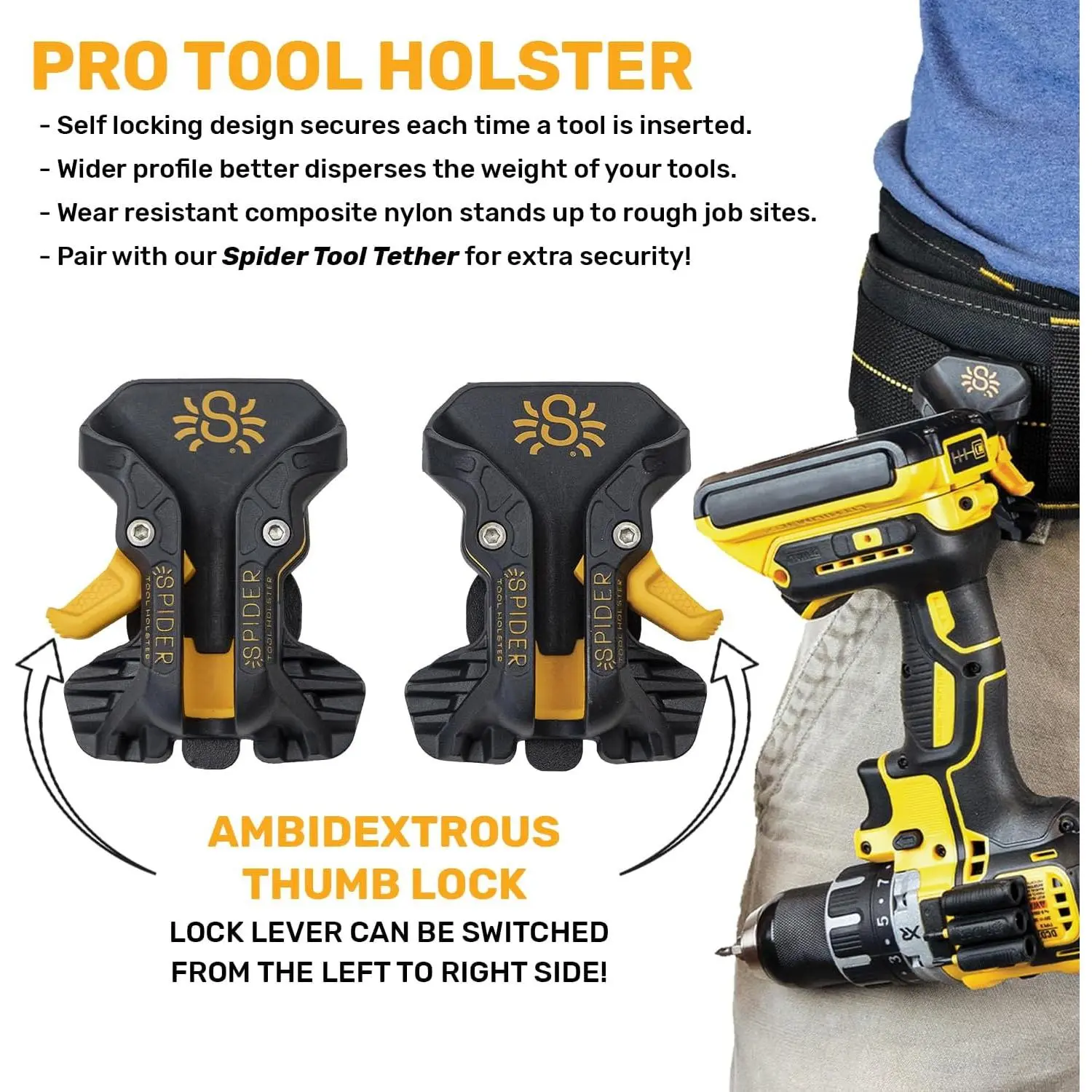 Pro Tool Holster - Upgraded, Self Locking, Quick Draw Universal Tool Holder with Ambidextrous Thumb Lock - Clips onto Any Belt - .com