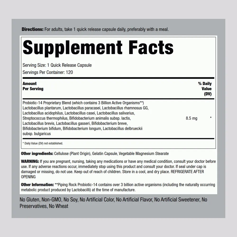 Take control of your lifestyle with Piping Rock's Probiotic-14 quick-release capsules! With 3 billion active organisms from 14 probiotic strains, each capsule provides maximum probiotic support for a healthy lifestyle. This probiotic with 3 billion bacteria from 10 strains work together to colonize your digestive tract with good bacteria. Our formula is gluten free and non-GMO, made with no preservatives, making it a popular choice for adult men and women everywhere! A healthy gut is important to overall wellness, so try our Probiotic-14 today and see the difference it could make for you!