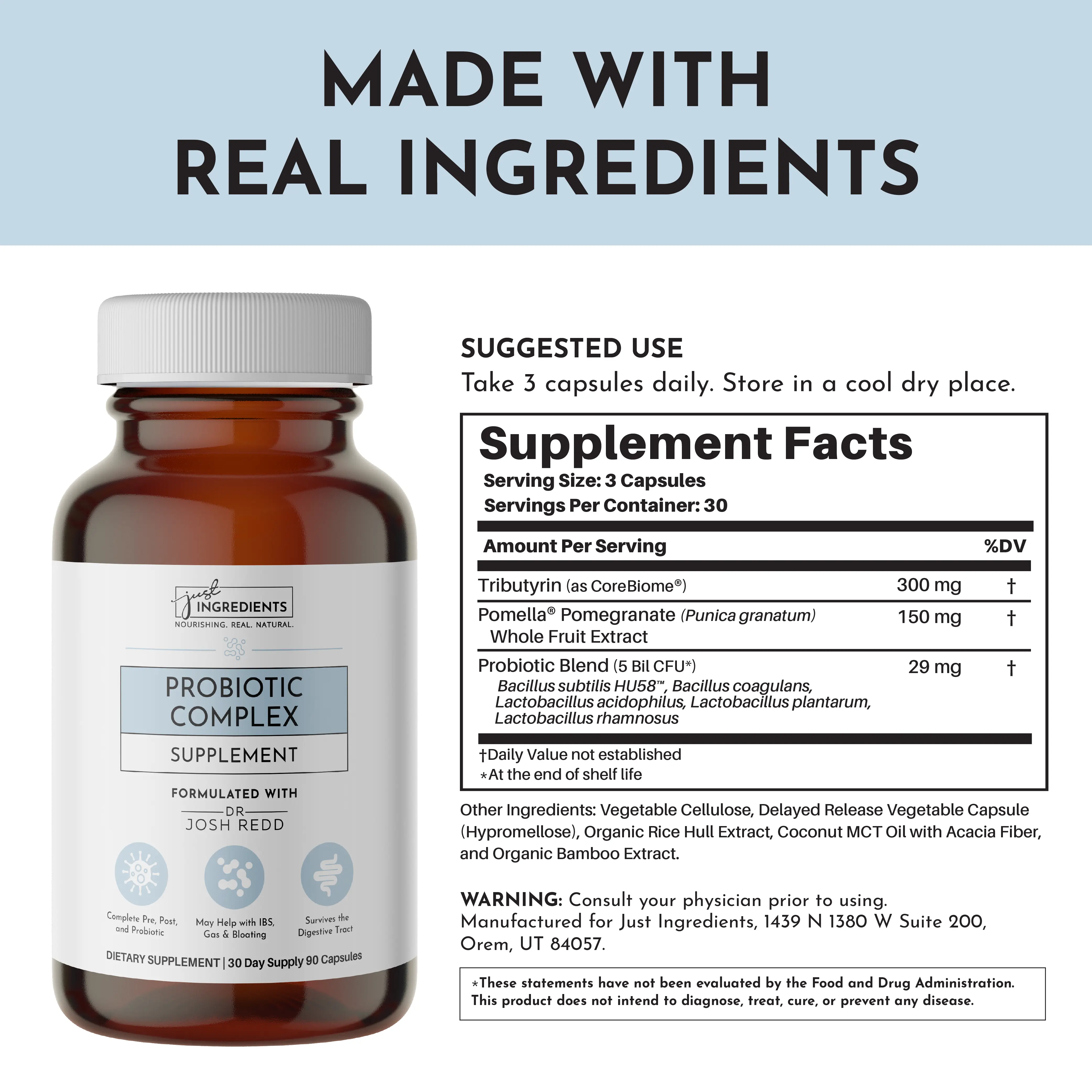 Just ingredients probiotic complex is amazing. It helps with your gut problems and has the ingredients of a probiotic blend in a Pamela pomegranate whole fruit extract. It has no bad harmful ingredients and can help with poor digestion. It can help with things like constipation, diarrhea, bloating, and gas. It’s a three and one blend of probiotics and is great for people that have digestive issues or problems with bowel movements gut issues or anyone trying to just get their gut health Back to health. This is the best probiotic out there that everybody needs to take.