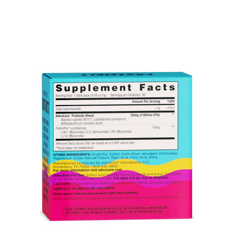 Probiotic FastMelt® is a convenient, fast-melting probiotic powder that provides 3 billion CFUs of friendly bacteria (probiotic) and prebiotics, which supports proliferation of good bacteria in the gut.Probiotics are beneficial bacteria that help to restore your body’s natural balance and wellness of the gut microbiome. When combined with prebiotics to increase their effectiveness, these two support immune and digestive health.FastMelt now consists of 3 probiotic strains, including the clinically validated Bacillus subtilis (DE111®), which has been the subject of more than 30 scientific studies. In addition to its digestive and immune health benefits, DE111® supports heart health and promotes a healthy cardiovascular system.Prebiotics act directly in the gut to help fight potentially harmful microbes.FastMelt also includes a unique blend of clinically tested prebiotic strains, PreforPro®, which work to increase the number of and enhance the function of friendly bacteria.