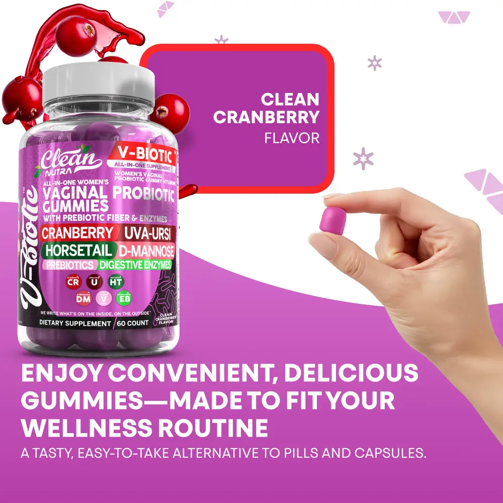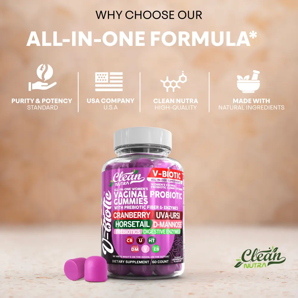 Support your digestive health with Women's Probiotic by Clean Nutra. Formulated with a blend of probiotics, prebiotics, digestive enzymes, fiber, cranberry, Dmannose, Uva Ursi, and Horestail.