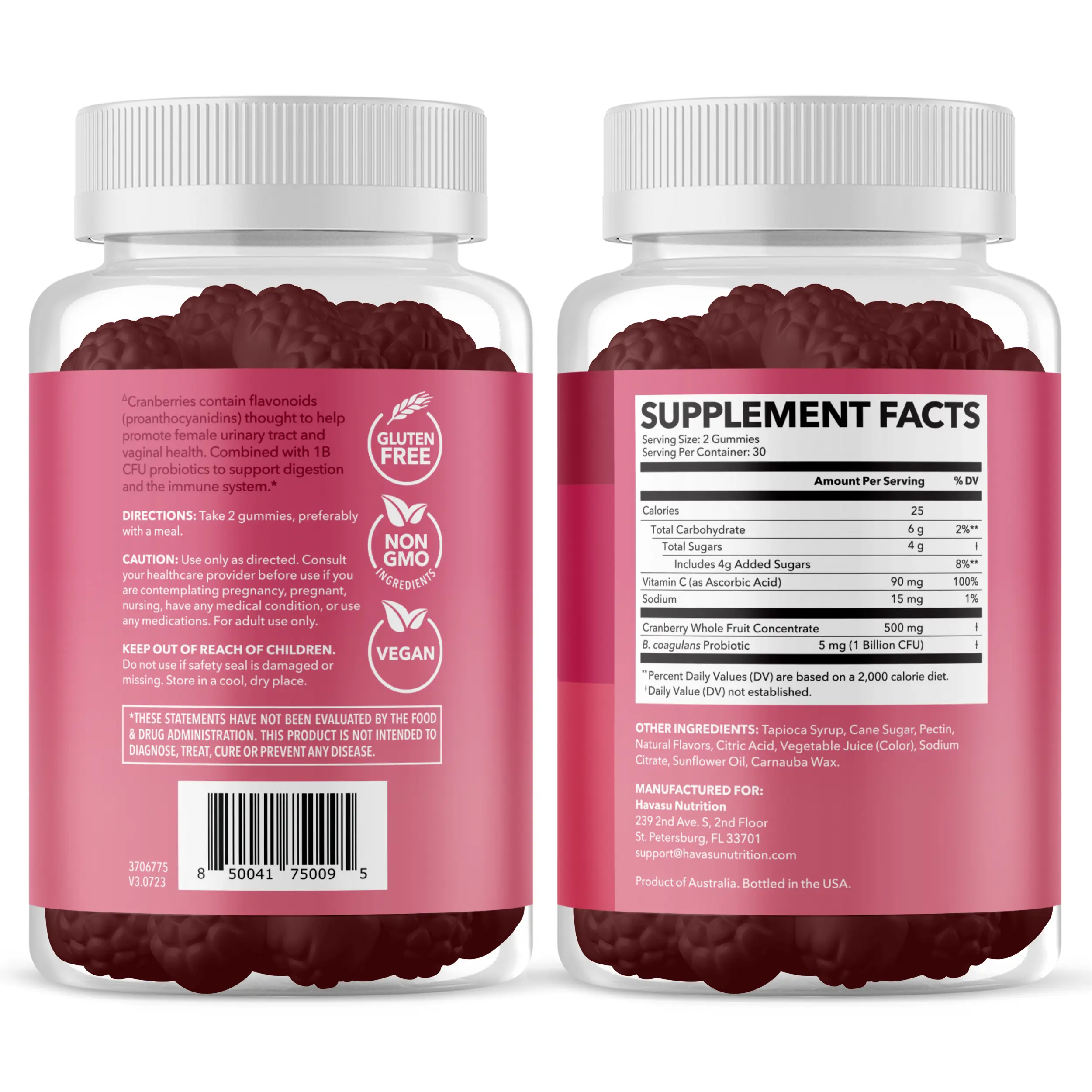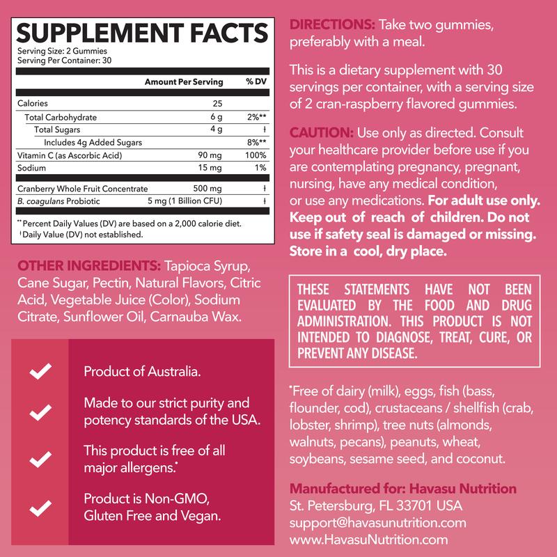 ·Probiotics For Women Gummies - Our Cranbiotic Gummies provide women with bloating relief as they are carefully infused with probiotics for digestive health. Havasu Nutrition cranberry gummies for women are designed to promote lactobacillus which may help with supporting gut health altogether.