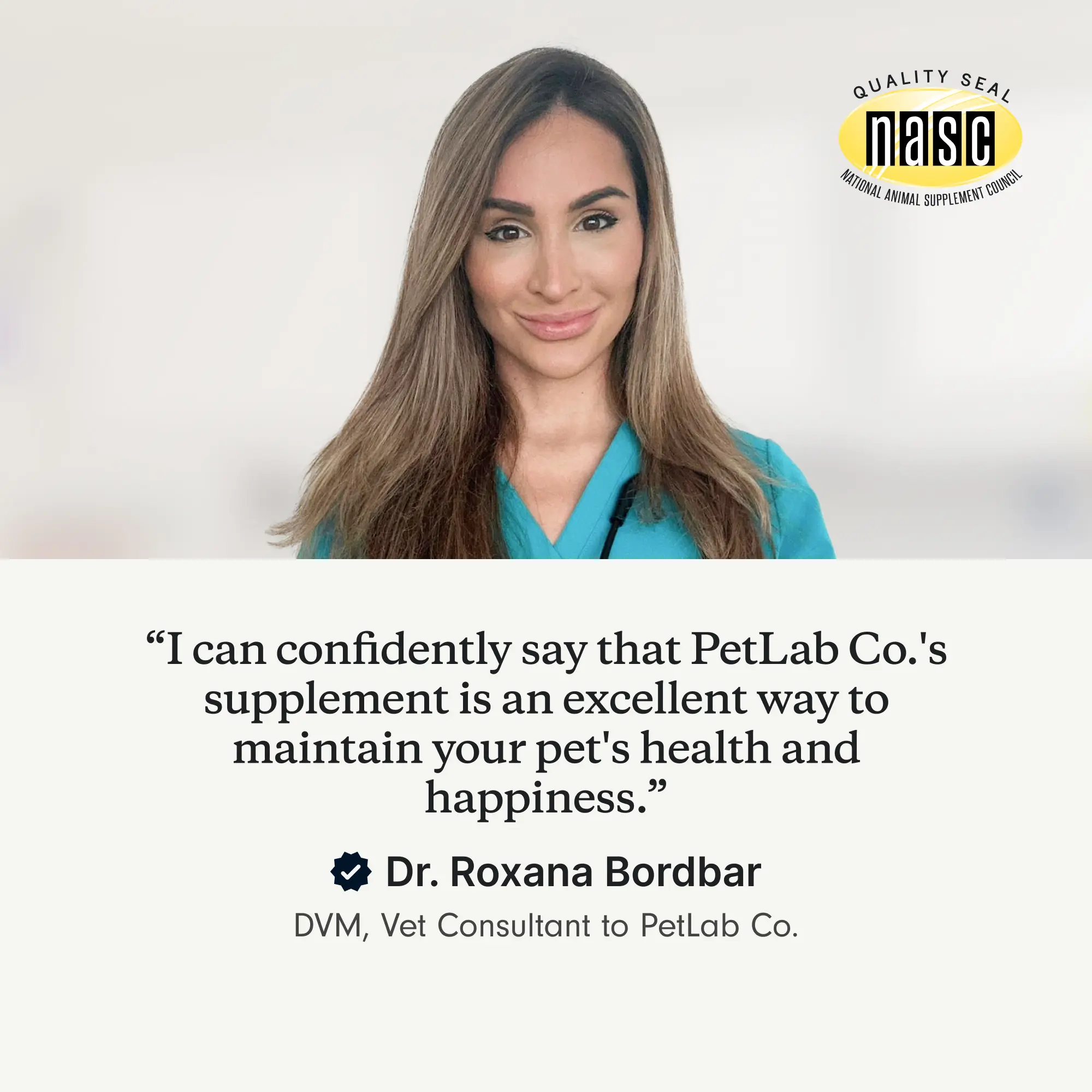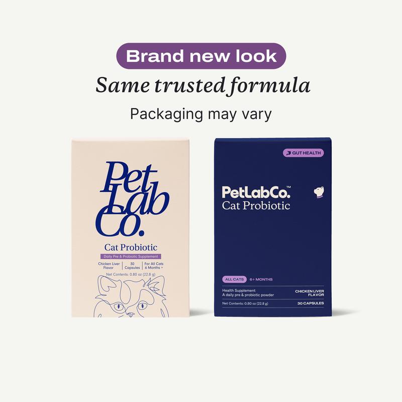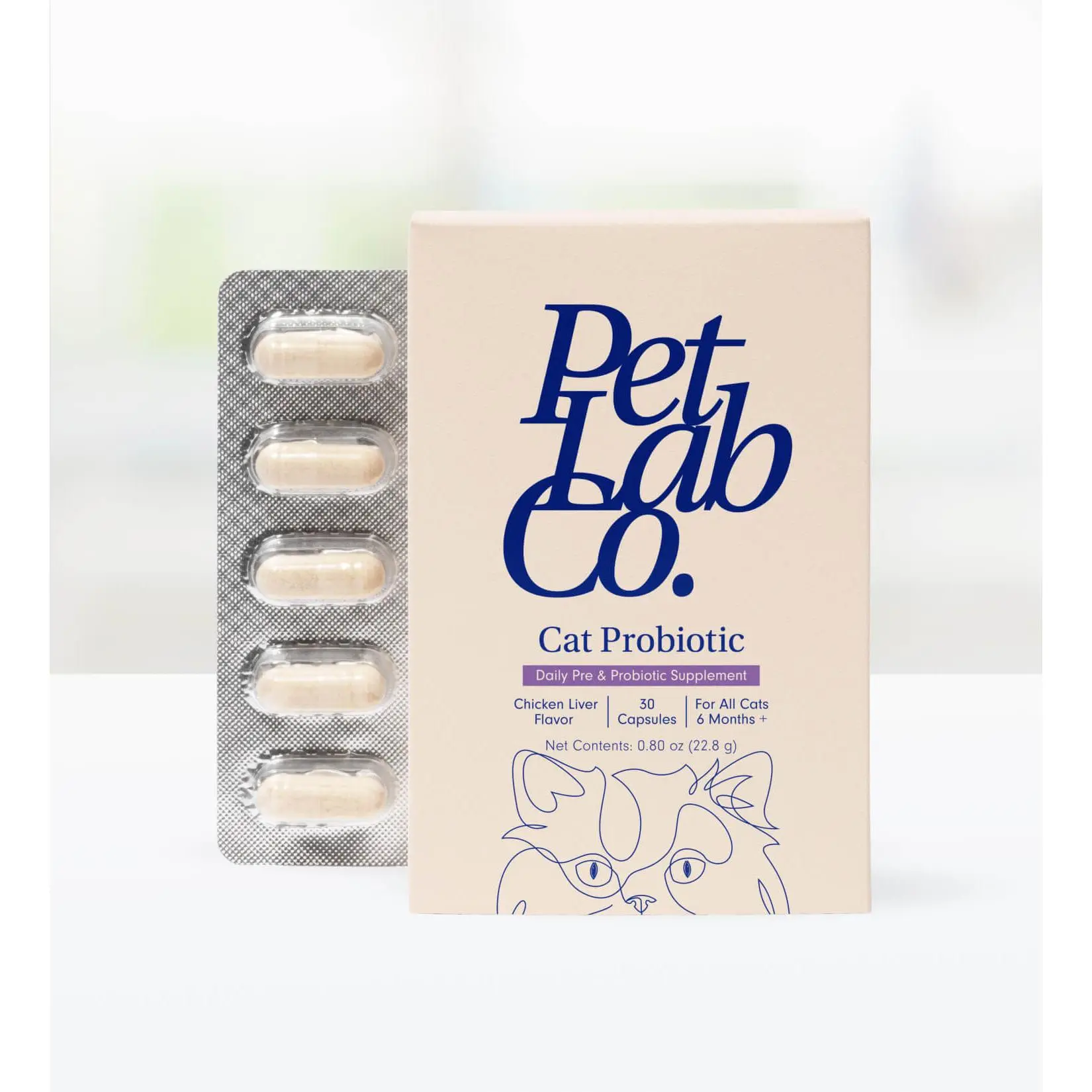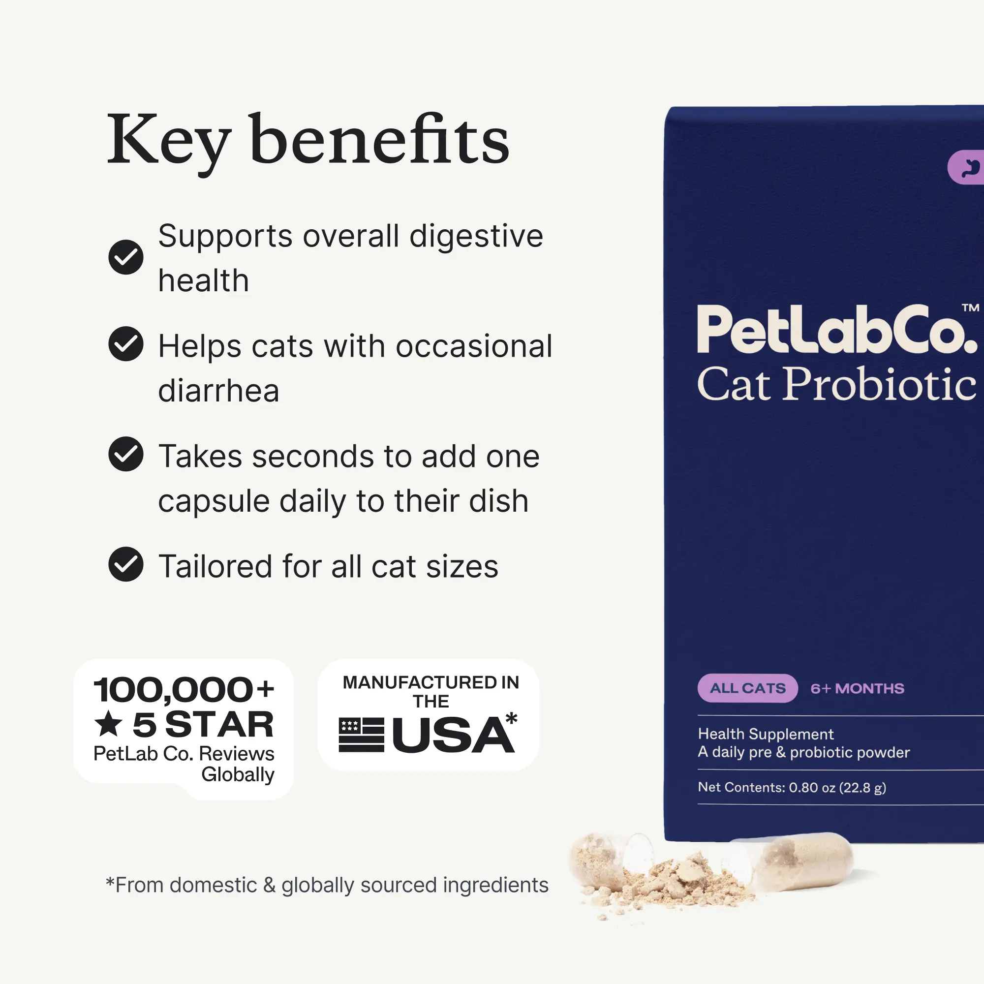 PetLab Co.’s Cat Probiotic features a proprietary, 6-strain probiotic blend that offers 2.1 billion CFUs. Combined with prebiotics, these feline probiotics promote the growth of beneficial gut microflora and support against bouts of smelly cat poop, soft stool, and occasional diarrhea.