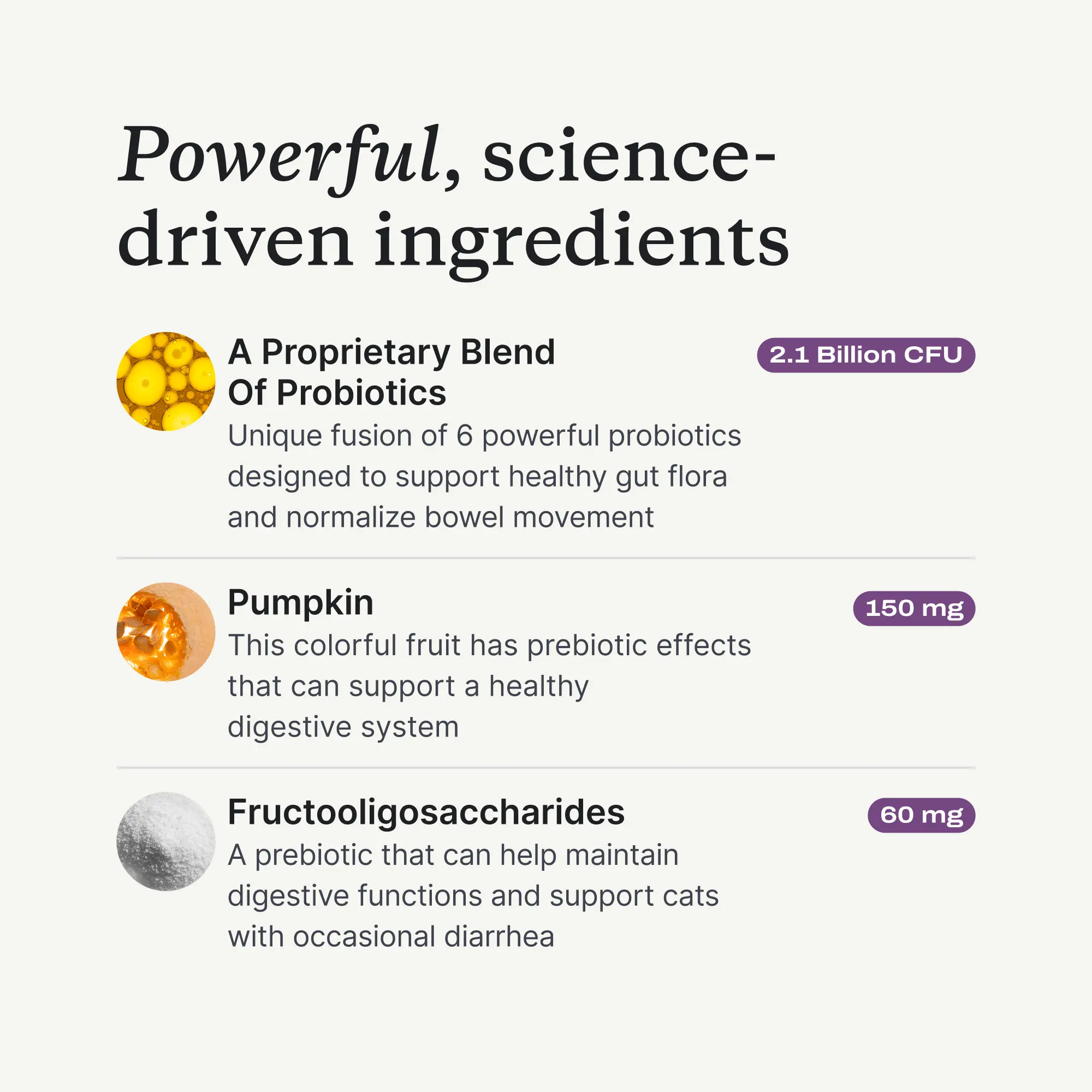 Our tasty probiotics for cats are packed with science-driven strains of probiotics, powerful prebiotics, and fibrous pumpkin to create the ultimate cat digestive supplement.