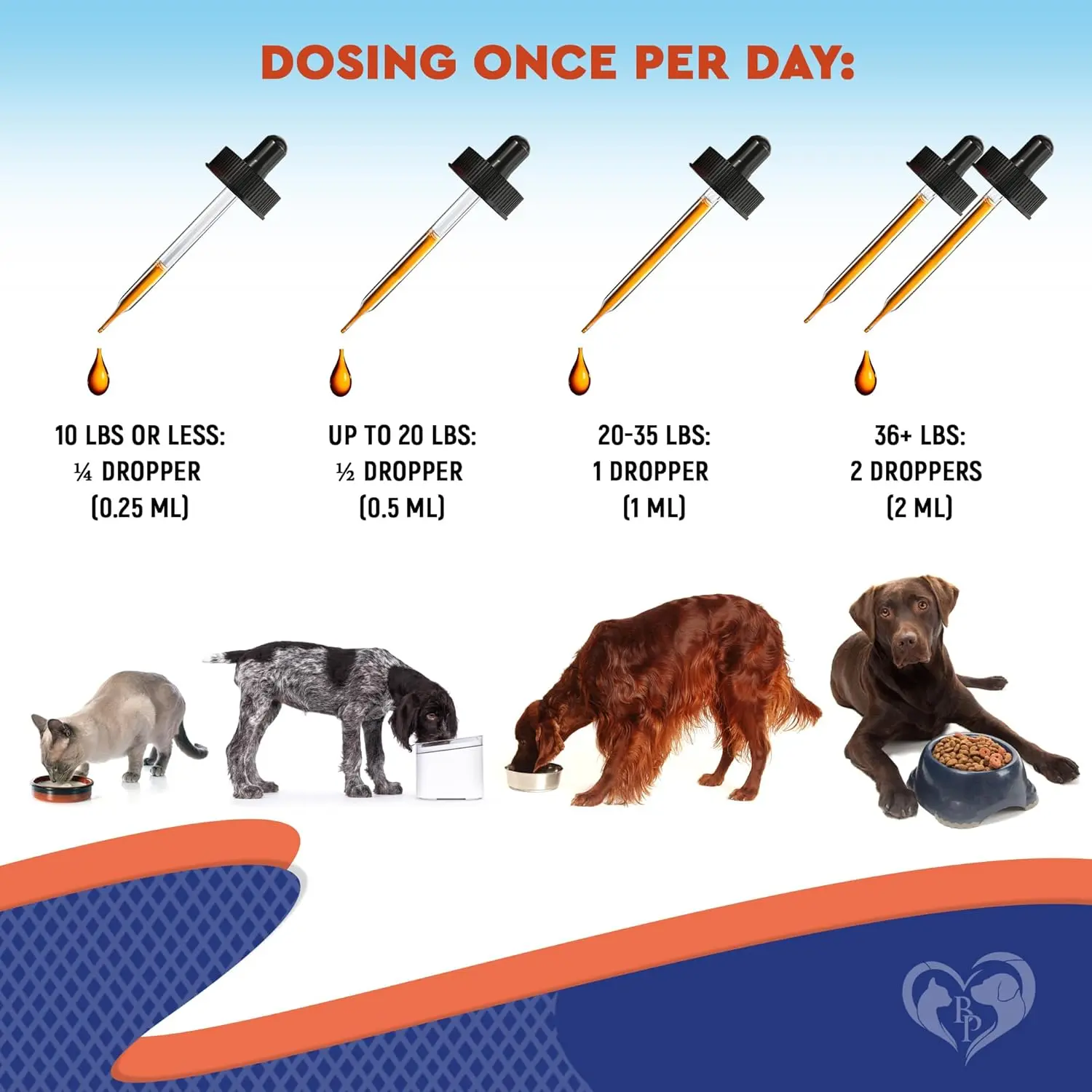 Product Specifications: Dosage: Cats, kittens, and small dogs (up to 20 lbs): ½ drop/day, Dogs 20–35 lbs: 1 drop/day Dogs 36+ lbs: 2 drops/day,