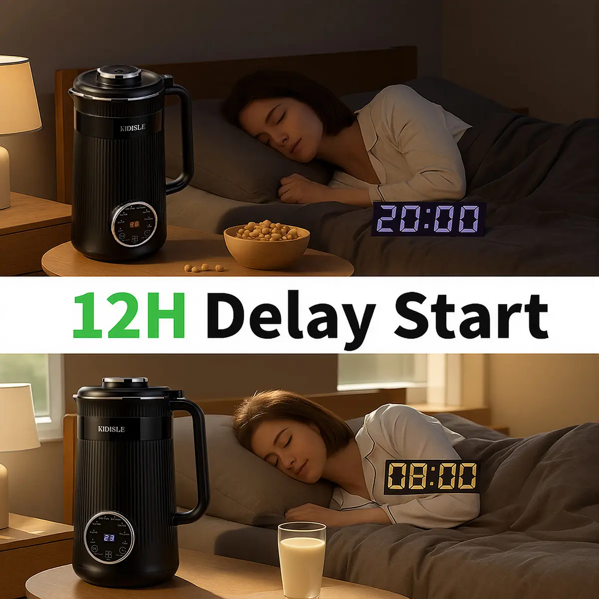8-in-1 Settings- Automatic Programs: 8 one-touch automatic programs for juice, soymilk, almond milk, milk shake, boiled water, oat milk, rice paste, and self-cleaning.- Delay Start: Up to 12 hours to prepare nut milk for the next day.