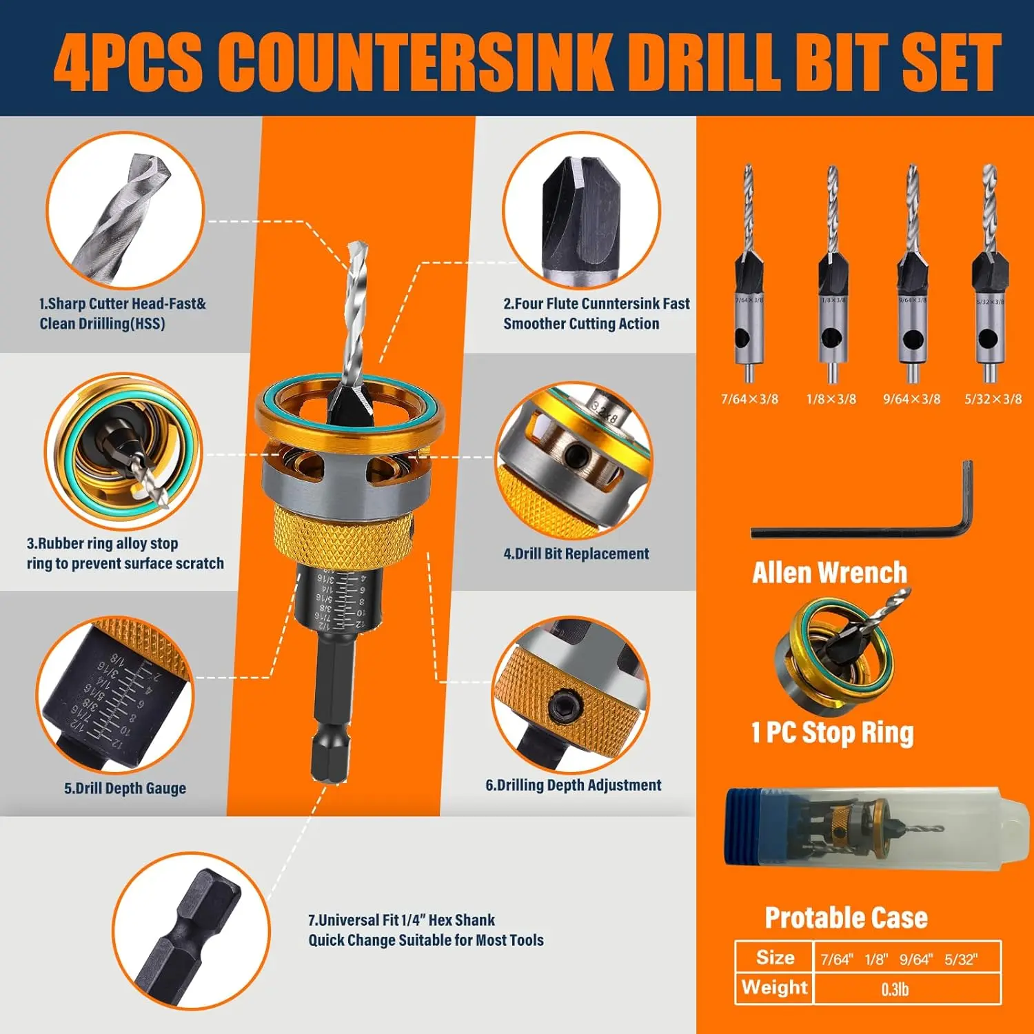 "Professional 4PCS Countersink Drill Bit Set with Adjustable Depth Stop & L-Shape Wrench | High Carbon Steel Four Blades for Smooth Woodworking, Plastic & Wood Projects | Essential Tool Kit for Perfect Flush Screws Every Time"