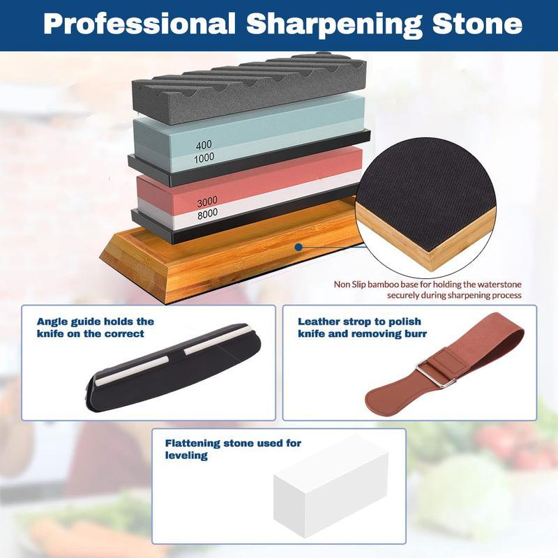 You don't need to become a professional to sharpen the blade, all you need is the correct tools and techniques. All the sharpening tools you need are here, providing you with an affordable set: 400/1000 and 3000/8000 grit sharpening stones; Rough ground stone; Stone fixing agent; Anti slip bamboo base; Grinding angle guide rail; Leather strap.