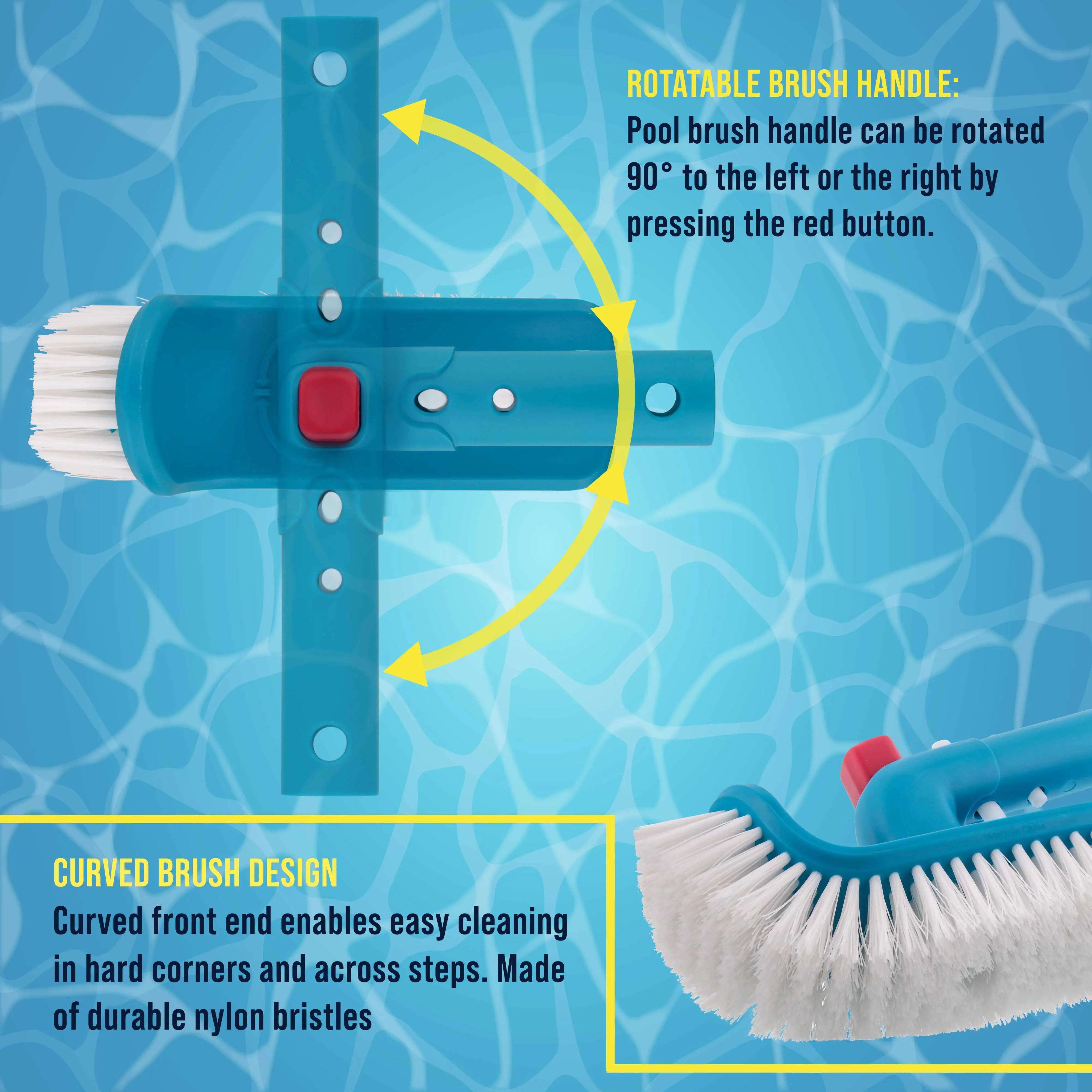 ·Rotatable Brush Hande: The specially designed pool brush handle can be rotated 90° to the left or the right by pressing the red button. A total rotation adjustment range of 180°, so you can adjust the brush angle to clean the hard-to-reach corner areas quickly.