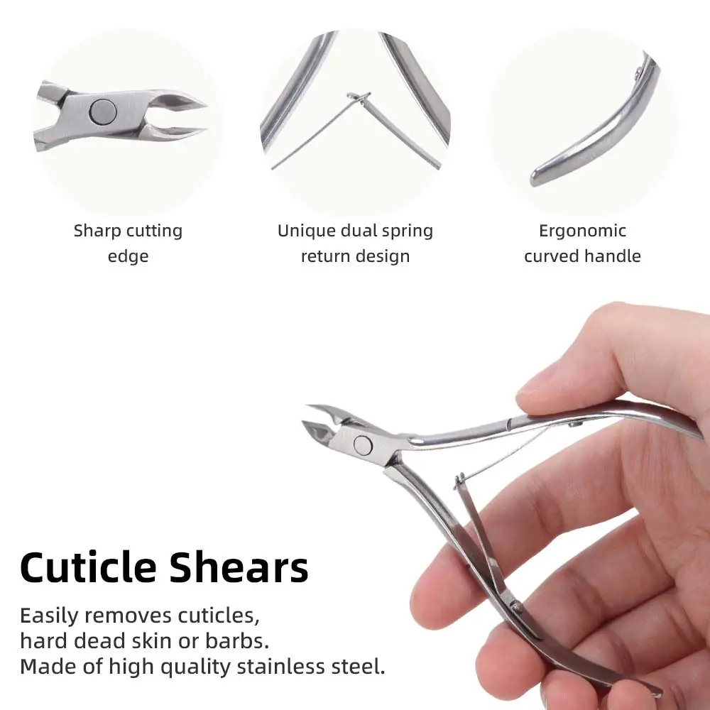 ·Effective Jaw Design Of the Cuticle Nipper - cuticle nippers professional have a scientific Jaw design which offers great grip for cutting cuticle off even in small areas around nails; The built-in spring can make our nail cuticle trimmer more flexible and durable, will not fall off, comfortable and simple during use.