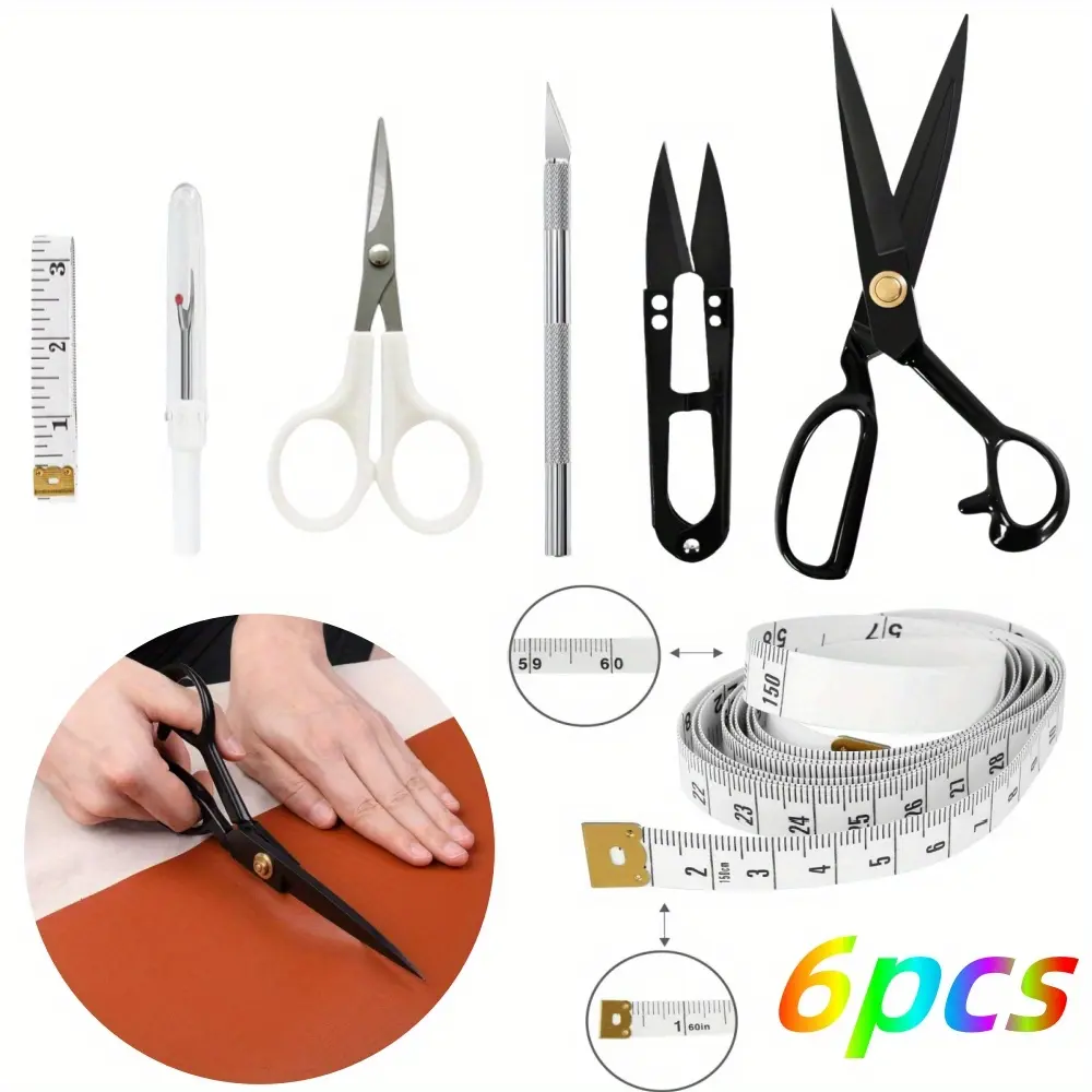 1 x 9 inch tailor scissors, 1 x tape measure, 1 x U-shaped scissors, 1 x wire cutter, 1x engraving knife, 1x white small scissors