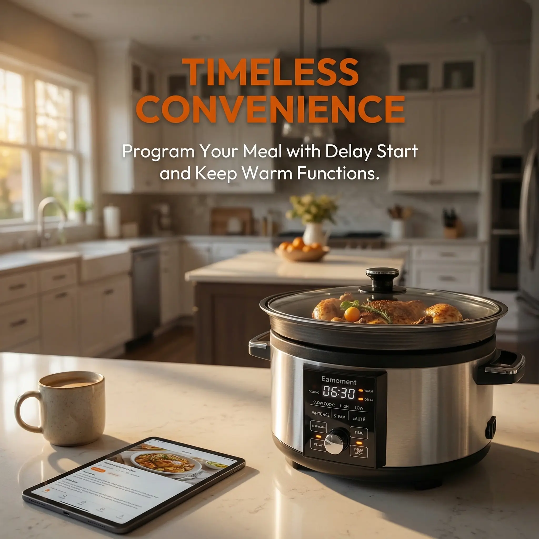 Conclusion:The Eamoment 5.5QT Programmable Slow Cooker with Timer is a versatile and space-saving kitchen appliance with multiple functions, a large capacity, and a non-stick pot for easy cleaning. It offers a delay function and fault protection to ensure safe and convenient cooking.