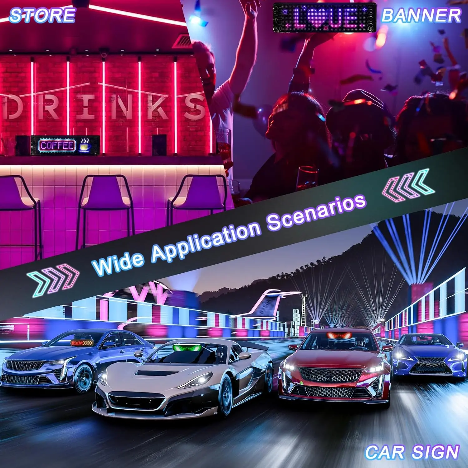 Widely Applied: IP65 rated novelty LED programmable sign supports common languages in the world. It can be freely attached to the wall or objects, or held in your hand to support your idol or express yourself on important occasions, and can be applied in , store, hotel, bar, restaurant, indoor advertising sign, concert, Christma or wedding decoration, etc.